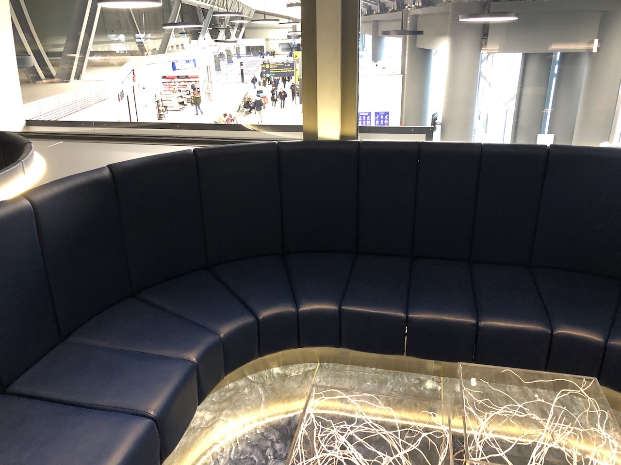 In der Mitte des Raumes sind mehrere Sessel platziert, diese hat niemand genutzt. Die wenigen Kunden haben sich auf die Sofas bzw. Sitzmöglichkeiten in den Ecken aufgehalten. Die Lounge liegt im Inneren des Terminals, durch die Fenster kann man auf das Geschehen am Check in Bereich blicken.