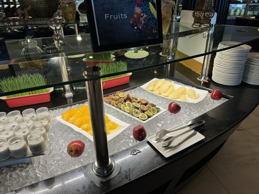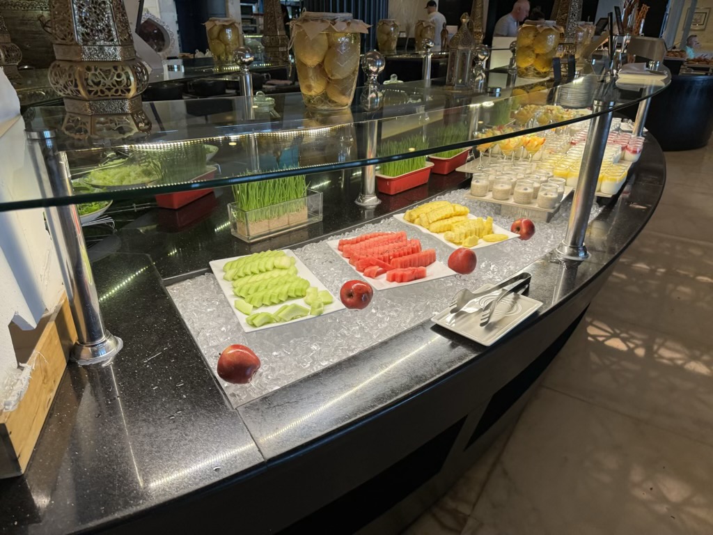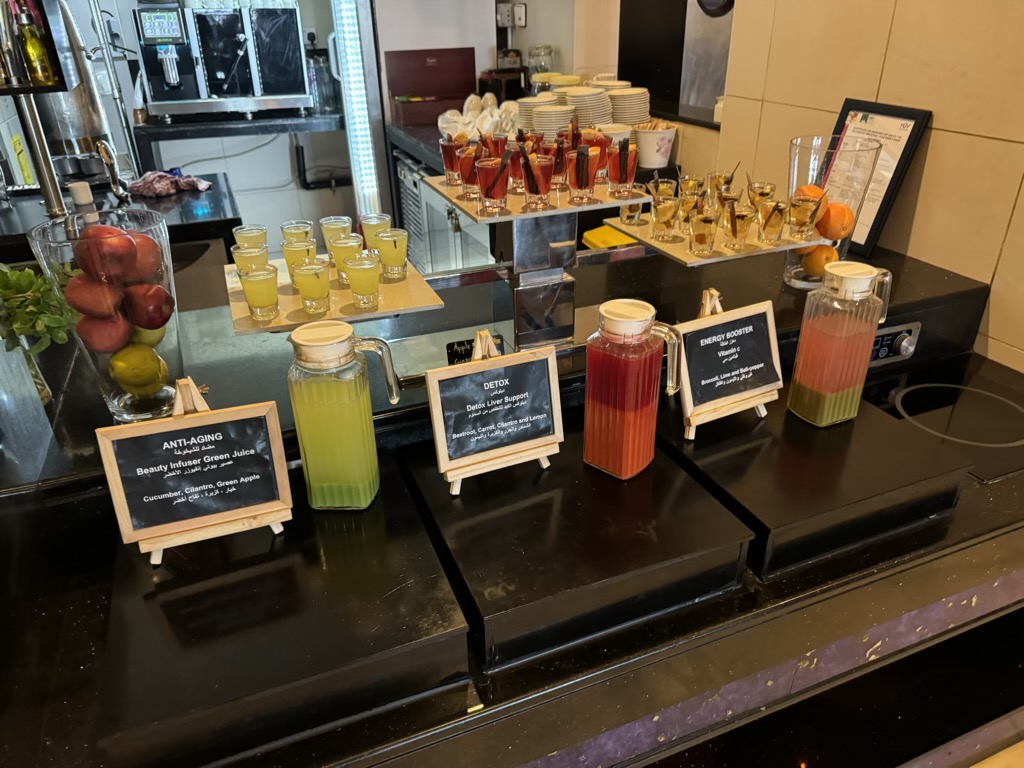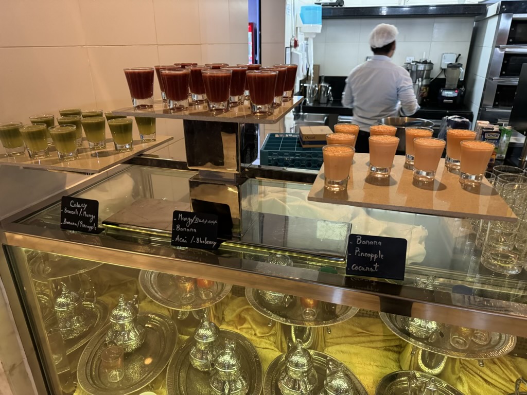 Das Buffet war umfangreich und sah sehr ansprechend aus. Viele verschiedene warme und kalte Speisen aus verschiedenen Nationen, die alle sehr gut schmeckten. An einer Live Cooking Station konnte man sich auch frische Eierspeisen, inklusive Eggs Benedict bestellen. Besonders angetan hatten es mir und den beiden Mädels die frischen Smoothies und Shots mit verschiedenen Geschmäckern. Christoph hat das Frühstück als "sehr gut" beschrieben, was schon ein Kompliment ist, denn wenn sich einer auskennt, dann er. Richtig schlecht hingegen war der Kaffee. Und das war kein Versehen beim ersten Kaffee, denn der zweite schmeckte genauso. Sein Kommentar dazu ist noch heute: ich weiß nicht, was genau man an einem Kaffeevollautomaten einstellen muss um so einen miesen Kaffee zu bekommen. Selbst mit Milch musste er ihn stehen lassen. Schade, denn ein guter Kaffee am Morgen ist vielen fast wichtiger, als eine große Auswahl am Buffet.
