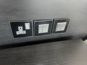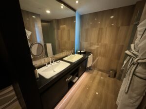 Wir haben für uns vier die Prestige Suite gebucht, da es hier einfach mit zwei Kleinkindern komfortabler ist. Durch das abgetrennte Wohnzimmer können wir, so wie wir es immer machen, die Kinder voneinander trennen und sie machen sich nachts nicht gegenseitig wach. Die Suite war, wie für eine Suite üblich mit einem WC ausgestattet, was sich direkt an der Eingangstür befindet. Dahinter stand linker Hand ein Tischchen, welcher mehr Schreibtisch als Esstisch war. Hier waren seitlich auch Kaffeemaschine, Wasser und andere nützliche Dinge untergebracht. Zentrales Element des Wohnzimmers war das Sofa mit Fernseher, hier haben wir auch gemeinsam in großer Runde zu Abend gegessen.