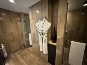 Mit einer Schiebetür abgetrennt befindet sich das Schlafzimmer mit tollem Blick aufs Meer und dem gemütlichen Bett. Dahinter ist ein begehbarer Kleiderschrank unter gebracht und das Badezimmer mit Dusche und Badewanne. Hier gab es ausreichend Handtücher und viele Amenities.