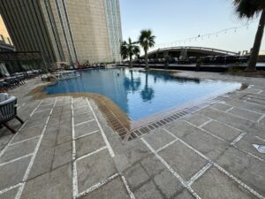 Einen direkten Strand hat das Sofitel Abu Dhabi Corniche nicht, aber man kann ihn fußläufig erreichen. Einen Pool hat das Hotel, dieser ist auch fast den ganzen Tag komplett im Schatten, was natürlich vor allem für Kinder super ist. Leider war das Wasser bei unserem Besuch sehr frisch und das Jacuzzi dauerbelegt. Wir haben sogar entdeckt, dass es ein Babybecken gibt, dieses war aber wirklich eisig und glich eher einer Kneippkur. Besonders schön war der Poolbereich nicht und man hat ihm definitiv die Jahre angesehen.