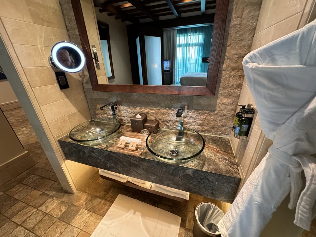 Hinter dem Schlafzimmer befand sich das Bad mit einer riesigen Badewanne. Hier hätte locker eine vierköpfige Familie Platz gefunden. Zudem beeindruckt das Bad mit Doppelwaschbecken, einer begehbaren Dusche und einem WC (GästeWC war auch vorhanden). Wir konnten im Badezimmer ausreichend Handtücher und Amenities vorfinden.