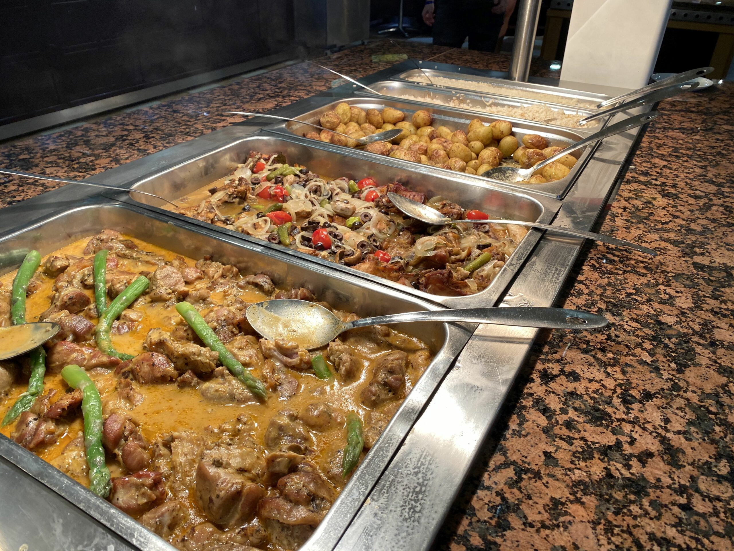 Die Angebotspalette des Mittag- (12.30 bis 14:30 Uhr) und Abendessens (18:00 bis 21:00 Uhr) sind gar nicht mal so unterschiedlich. So gibt es immer einen Bereich mit Salaten und Tapas (der täglich wechselnde Chefsalat ist dabei das Highlight und immer mit viel Liebe zum Detail zusammengestellt). Dazu einige fertige warme Gerichte und diverse Show-Cooking-Stations, an denen Fisch-, Wok- und Fleischgerichte frisch zubereitet werden. Wer davor noch eine warme Vorspeise benötigt, wird ebenfalls glücklich. So werden täglich wechselnd Pasta-Gerichte, Frühlingsrollen, Onion-Rings und co. zubereitet.