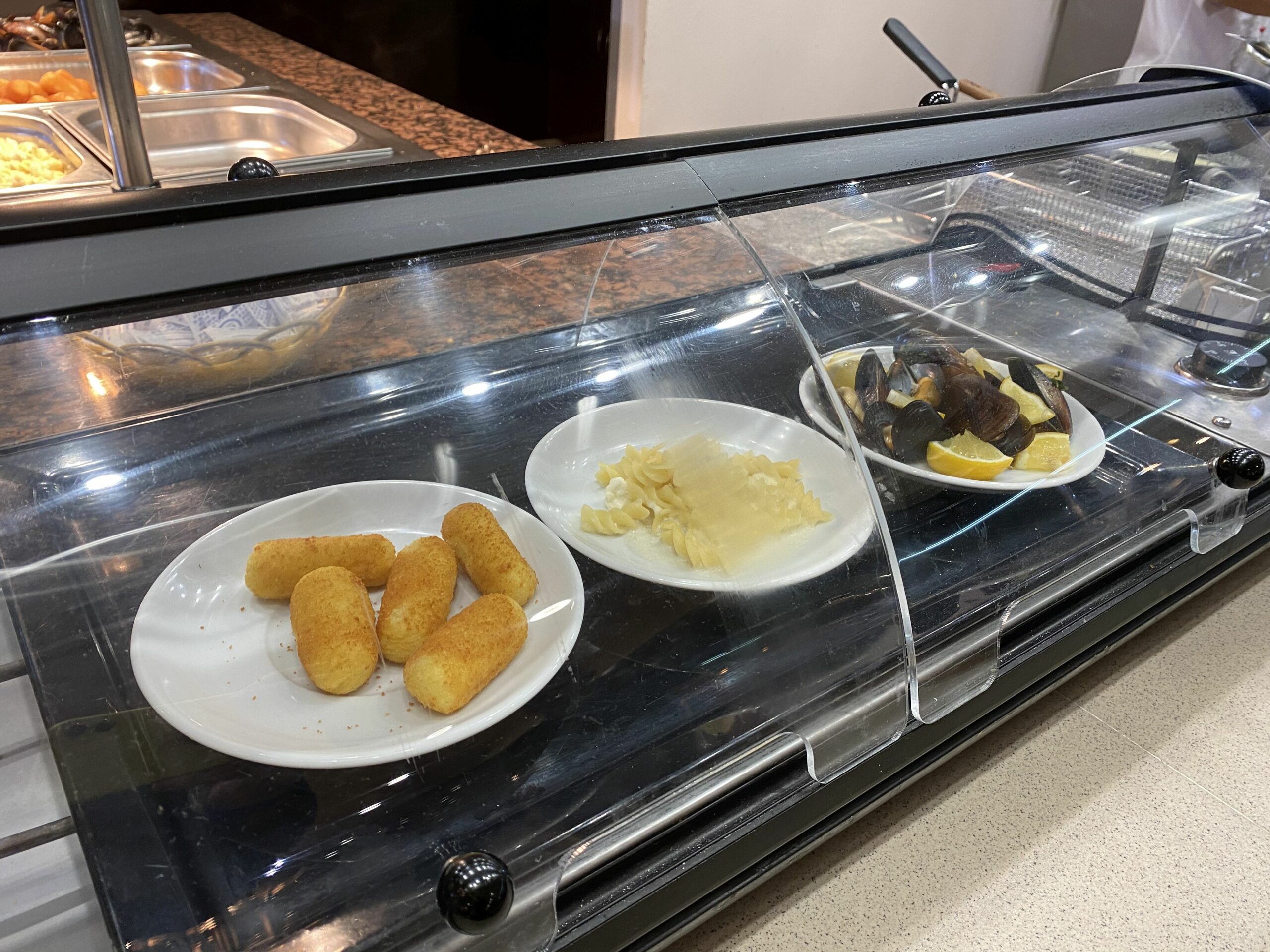 Zwischen Frühstück und Abendessen gibt es quasi kein Zeitfenster, an dem es nichts zu Essen gibt. So wird an der Poolbar direkt nach dem Frühstück ein kleines Snackbüffet aufgebaut und frische Donuts angeboten. Gegen Mittag kommen dann sukzessive Hotdogs, Paella, Pommes frites und Pizza dazu. Während die Hotdogs sehr einfach waren (Wurst in Brötchen gesteckt), war die Pizza top.