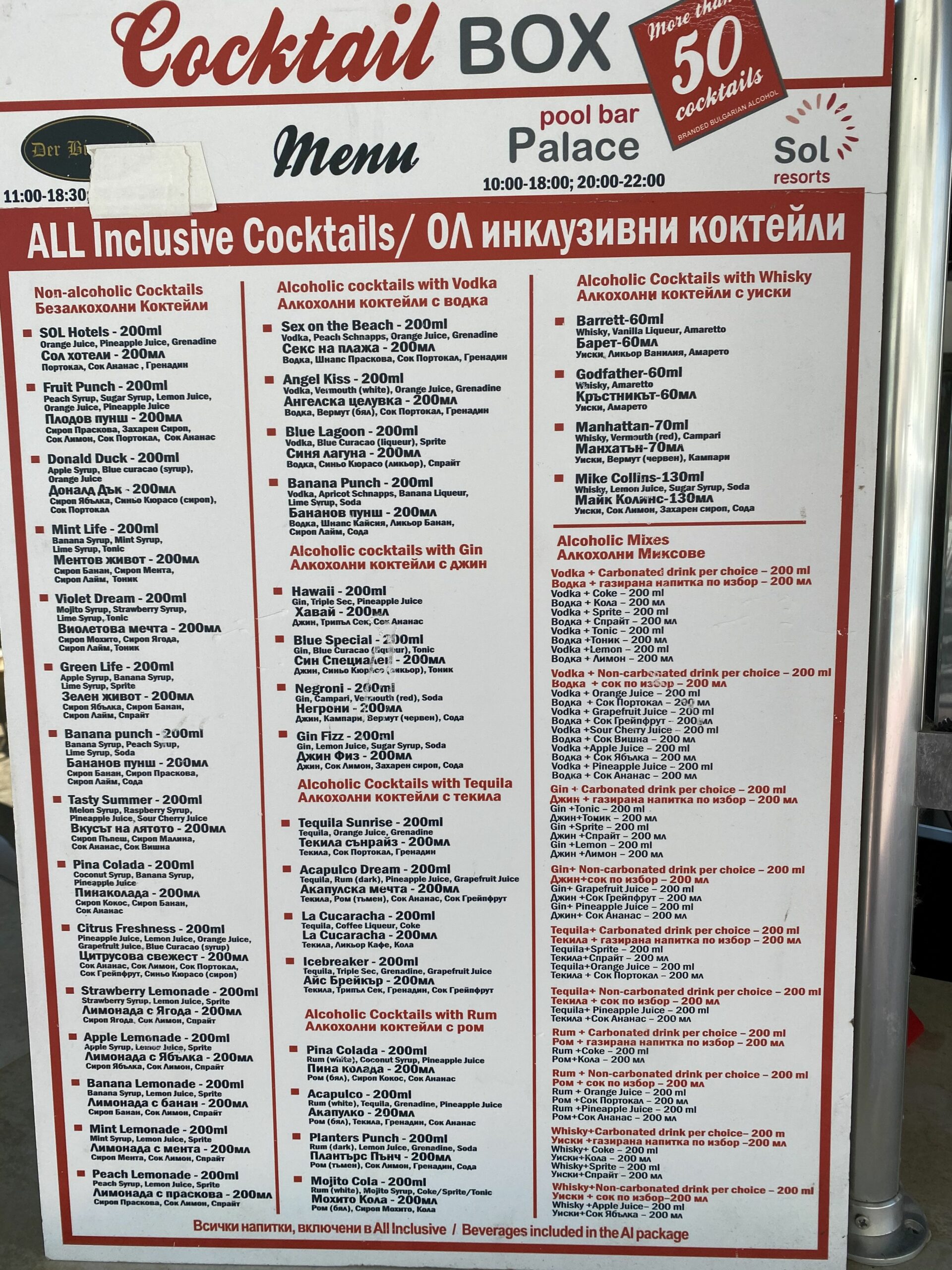 Zentraler Anlaufpunkt außerhalb der Essens-Zeiten ist für viele Gäste die Pool-Bar. Hier werden neben Sofdrinks, Wein und Bier auch Longdrinks und Cocktails aus dem Automaten zubereitet. Wie überall im Resort stammen die Spirituosen dafür aus Bulgarien und sind von der mir bis dahin nicht bekannten Marke Savoy. Wer wirklich ein Getränk genießen will, muss sich ehrlicherweise nach einer Alternative umsehen.
