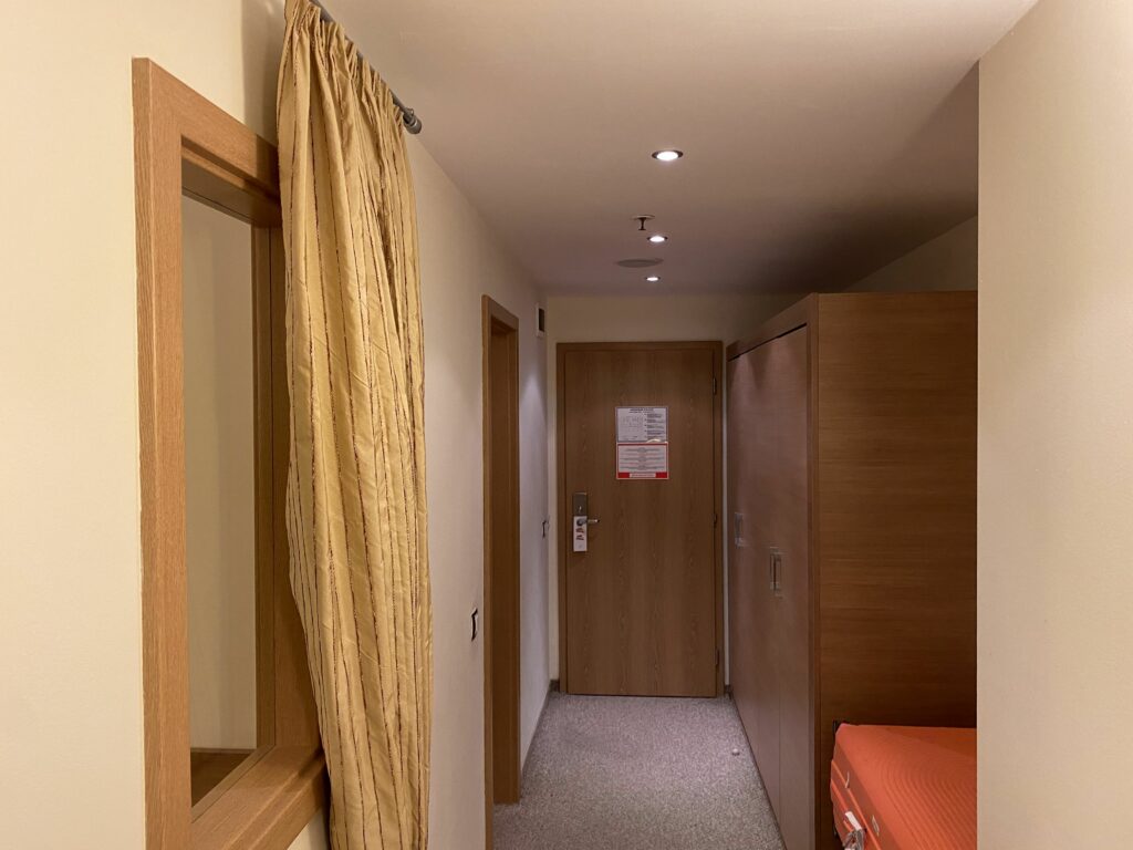 Nachdem wir mit unserer Schlüsselkarte (es gab nur eine) die Zimmertür geöffnet hatten, standen wir in einem verhältnismäßig langem Gang. Direkt auf der linken Seite des Ganges befanden sich gleich mehrere Schränke. Auf der gegenüberliegenden Seite konnten wir zunächst in das Bad abbiegen und die zweite Tür führte zu einem kleinen Raum mit zwei Einzelbetten für Kinder. Für Licht sorgten zum Hauptzimmer und Gang innenliegende Fenster.