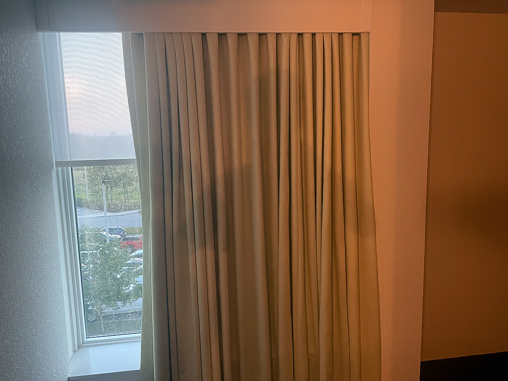 Hinter dem Raumtrenner erstreckt sich dann das langgezogene Zimmer mit den beiden Betten, die sich einen Nachttisch teilen. Ganz hinten im Zimmer befinden sich der in der Wand versteckte Kleiderschrank und noch ein Fenster. Unter dem Fester wiederum steht ein großes Klimagerät.