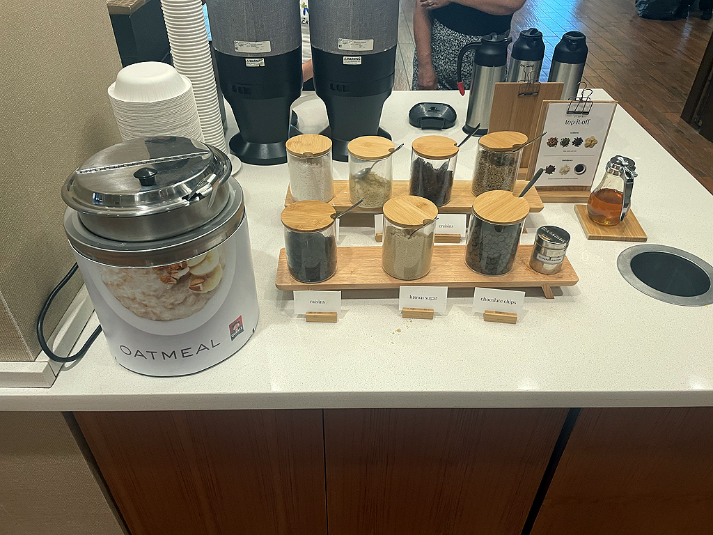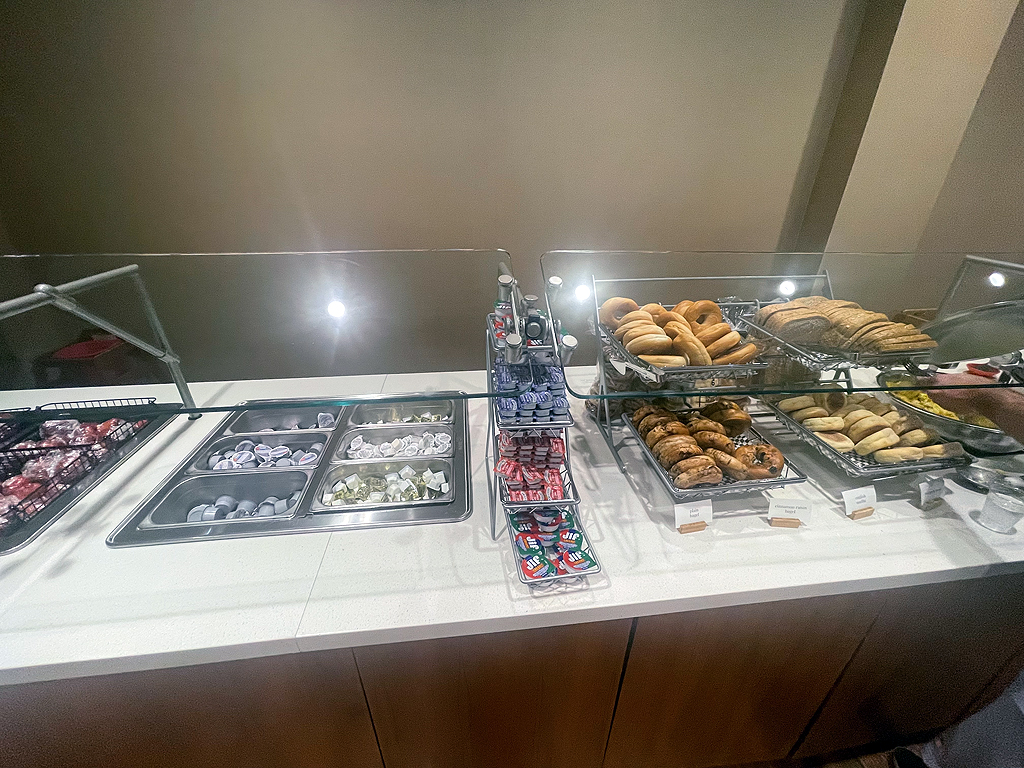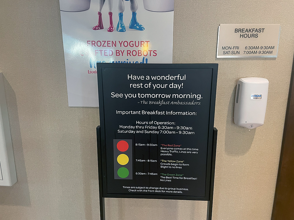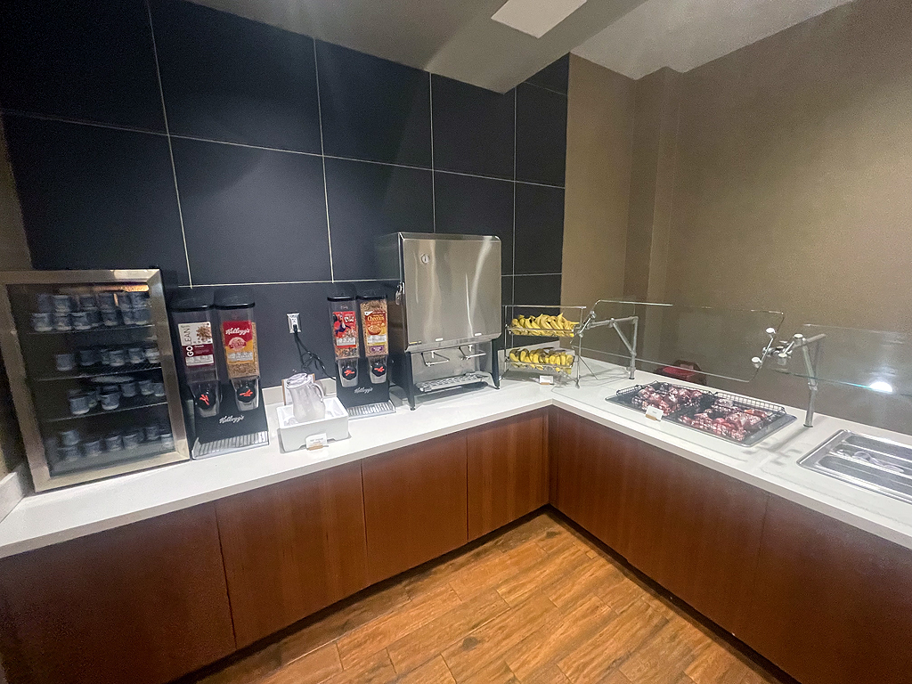 Das Frühstück war ausreichend, um eine Grundlage zu legen, doch war es weder umfang- noch abwechslungsreich. An Getränken gibt es Orangensaft, Apfelsaft, Kaffee, Tee, Milch und Wasser. Allerdings besteht die Möglichkeit, an einer Starbucks-Theke Kaffeespezialitäten zu kaufen. Alle Getränke werden in Plastik- Schaumstoffgefäße gefüllt. Beim Obst standen Bananen, Orangen und Äpfel (einzeln in Plastik eingewickelt und vom Hotel als Birnen bezeichnet) zu Auswahl. Von der Firma Kellogg’s gab es verschiedene Ceralien zu Auswahl. Diese können wahlweise mit Milch oder Joghurt kombiniert werden. Wer es etwas substantieller mag, findet Bagles (mit und ohne Zimt/Rosinen), Toastbrotscheiben und „English Muffins“. Diese können mit Marmelade oder Erdnussbutter bestrichen werden.