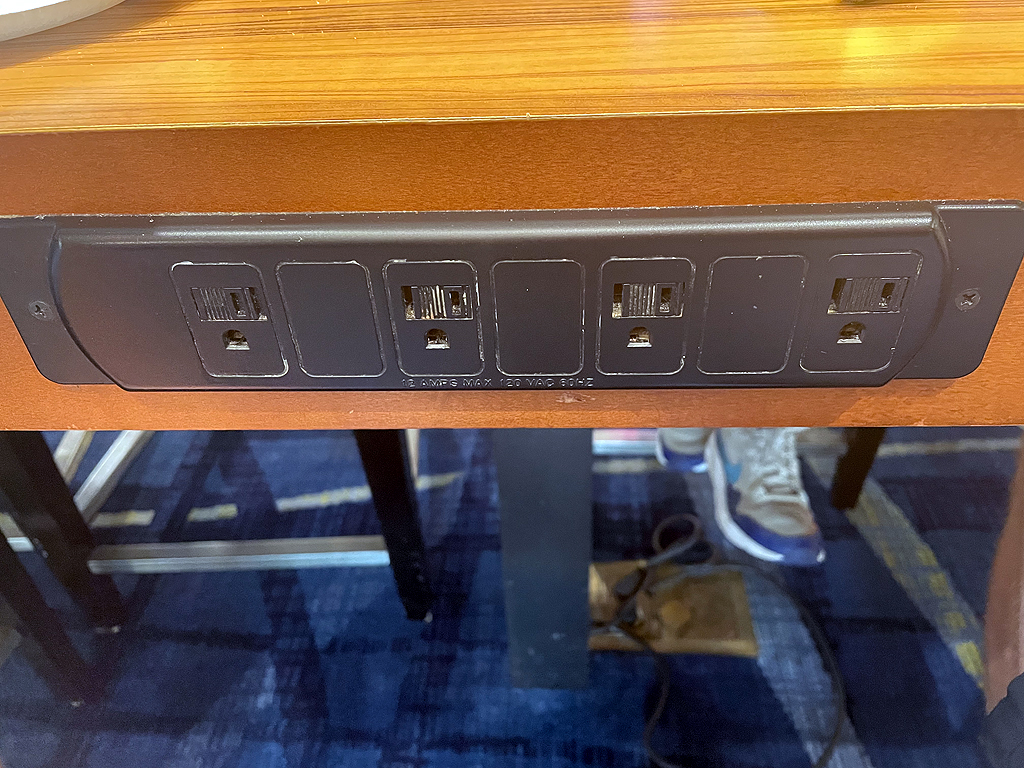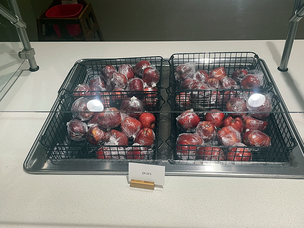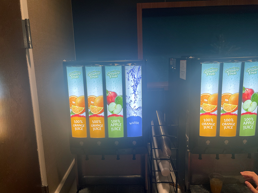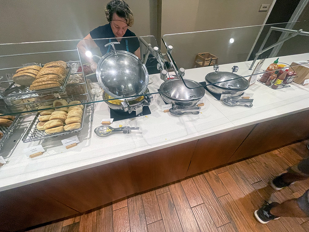 Das Frühstück war ausreichend, um eine Grundlage zu legen, doch war es weder umfang- noch abwechslungsreich. An Getränken gibt es Orangensaft, Apfelsaft, Kaffee, Tee, Milch und Wasser. Allerdings besteht die Möglichkeit, an einer Starbucks-Theke Kaffeespezialitäten zu kaufen. Alle Getränke werden in Plastik- Schaumstoffgefäße gefüllt. Beim Obst standen Bananen, Orangen und Äpfel (einzeln in Plastik eingewickelt und vom Hotel als Birnen bezeichnet) zu Auswahl. Von der Firma Kellogg’s gab es verschiedene Ceralien zu Auswahl. Diese können wahlweise mit Milch oder Joghurt kombiniert werden. Wer es etwas substantieller mag, findet Bagles (mit und ohne Zimt/Rosinen), Toastbrotscheiben und „English Muffins“. Diese können mit Marmelade oder Erdnussbutter bestrichen werden.