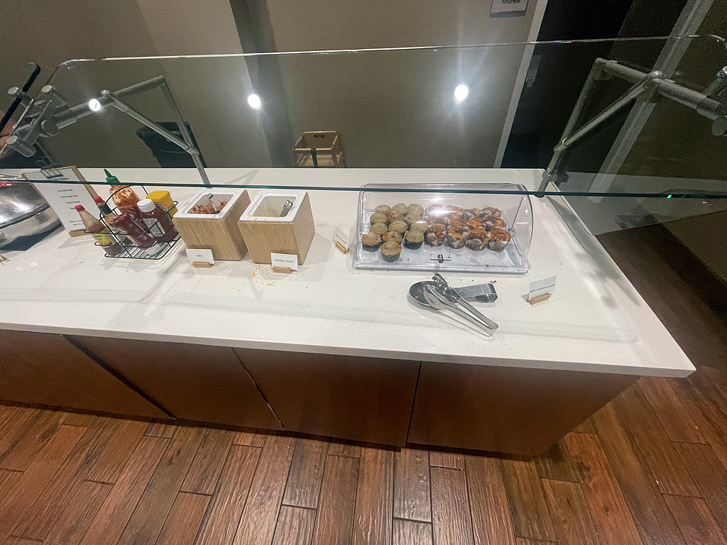 Wer lieber etwas Warmes essen möchte, darf sich mit Rührei, Truthahn- oder Schweinewürstchen eindecken. Dazu gibt es Ketchup, amerikanischen Senf und verschiedene scharfe Saucen. Darüber hinaus gab es noch Muffins und Oatmeal, das mit verschiedenen Toppings geschmacklich auf Vordermann gebracht werden kann.