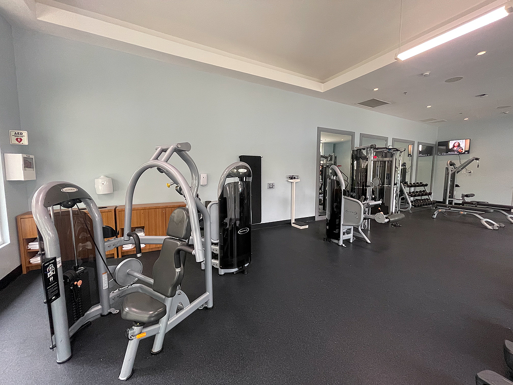 Der Fitnessraum ist ordentlich ausgestattet mit Cardiogeräten (hauptsächlich Laufbänder) und solchen, an denen Gewichte in geführten Bewegungen bewegt werden. Die freien Gewichte haben jeweils kein hohes Gewicht.