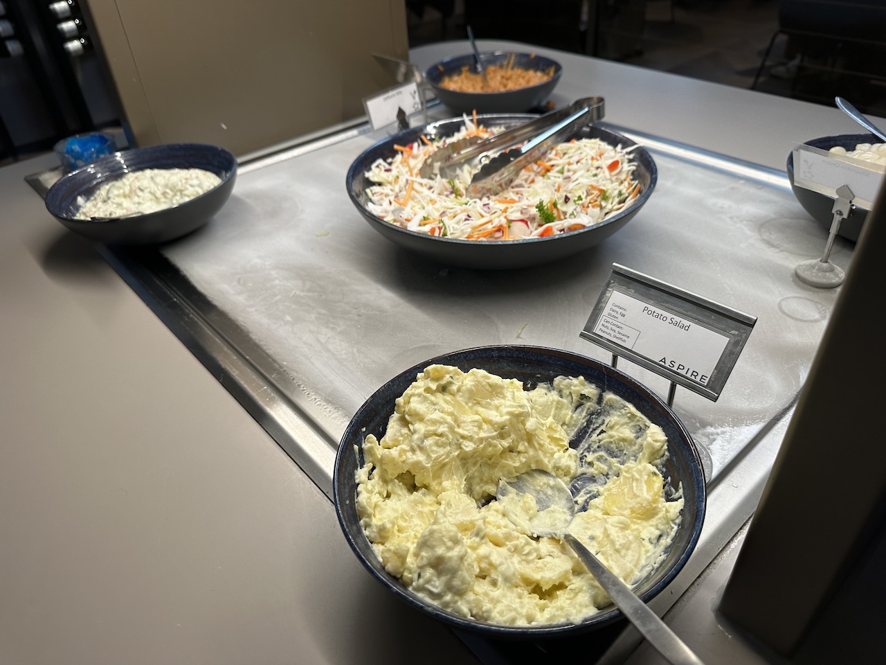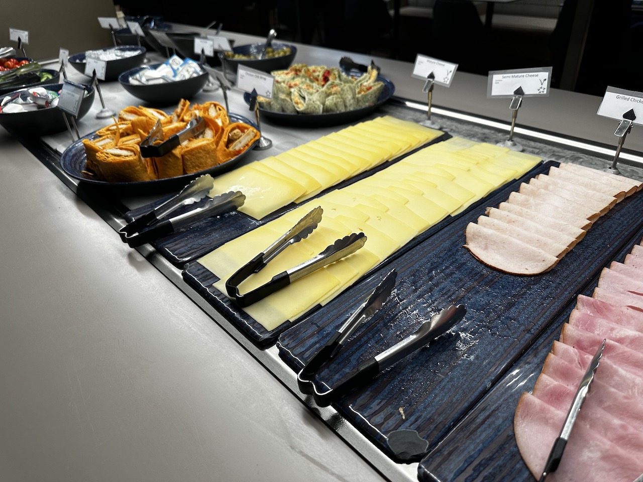 In der Mitte der Lounge steht ein Buffet mit kalten Speisen. Darunter Salate, Snacks, Obst, Dips, Aufschnitt usw.