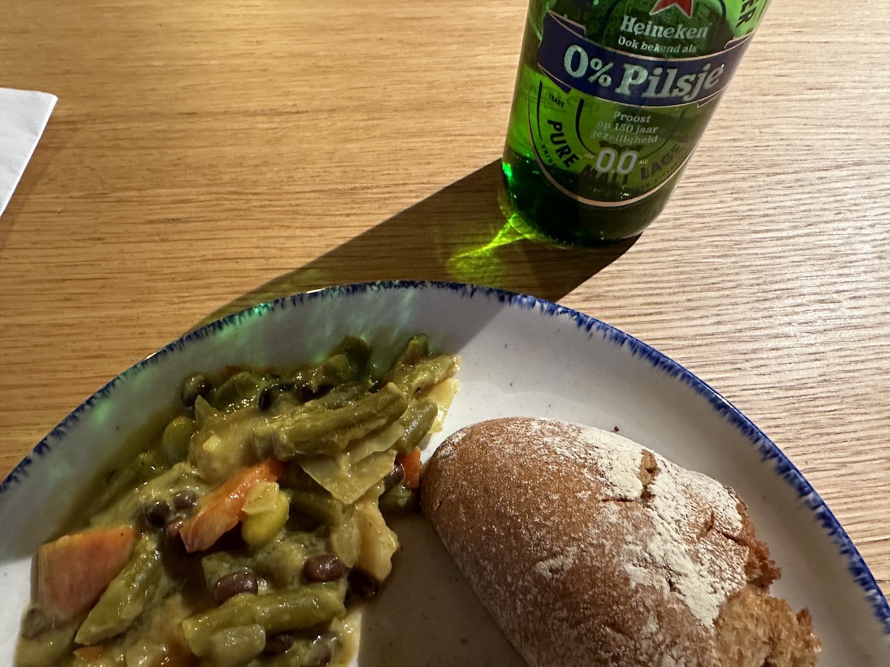 Nebenan befindet sich eine warme Theke, dort waren etwa fünf oder sechs Gerichte mit Beilagen. Darunter Fleischbällchen, Kokoscurry, Suppe, Pasta & Reis. Das warme Brot wurde gerade aufgeschnitten.