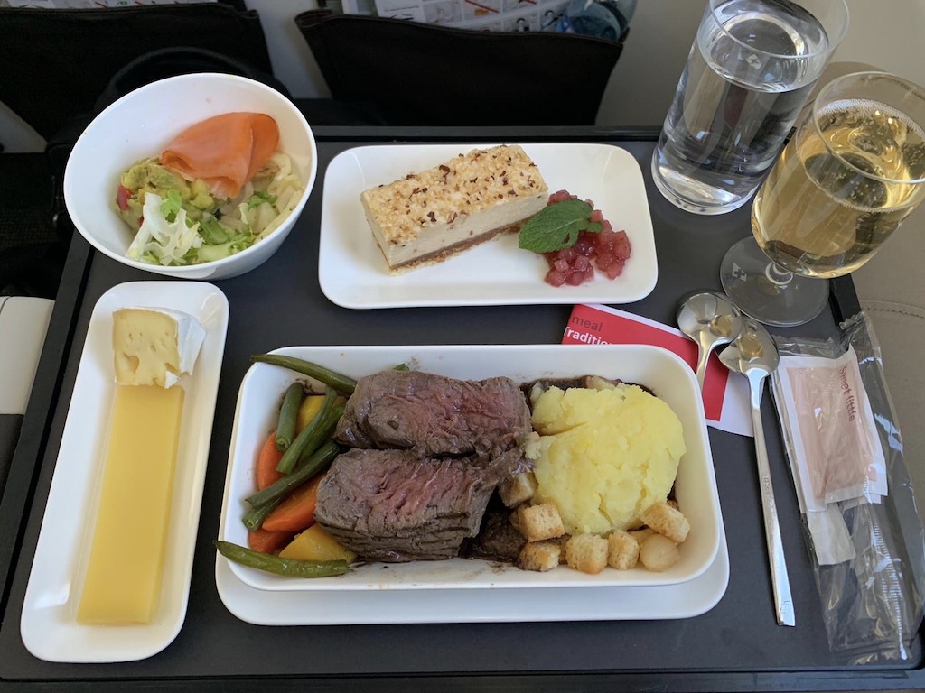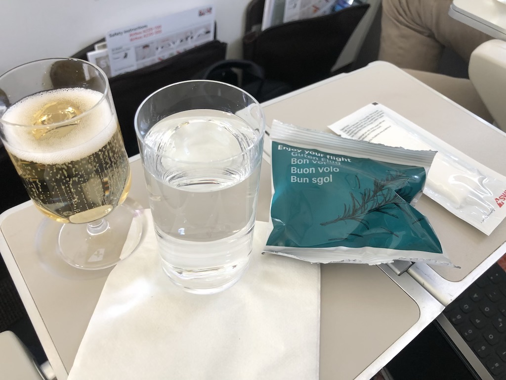 Nach dem Start bereiteten zwei Flugbegleiter den Service vor und servierten zunächst einen Aperitif und Rosmarincracker. Die beiden waren ausschliesslich in der Business Class tätig und immer ansprechbar. Swiss serviert auch auf kurzen Flügen Champagner, heute aus dem Haus Duval Leroy. Die Gläser wurden vor dem Essenservice nochmals aufgefüllt. Es gab zwar keine heissen Tücher oder Speisekarten, bei der Flugzeit von gut 2 Stunden ist das aber akzeptabel. Der Purser hat uns namentlich angesprochen und uns die Auswahl der warmen Hauptgänge erklärt.