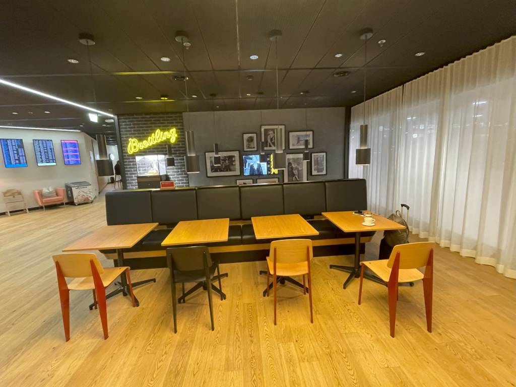 Das Design ist minimalistisch, wie man es auch aus der SWISS Alpine Lounge kennt. Die Räume sind mit Eichenholz-Parkett ausgelegt. Passend dazu sind Sitze, Hocker und Tische ebenfalls aus Holz. Die bequemeren Sessel wurden in Schwarz aufgepolstert, und manchmal findet man die typisch roten Akzente von SWISS. Heraus sticht eine geklinkerte Wand, die dem Uhrenhersteller Breitling das passende werbliche Umfeld bietet.