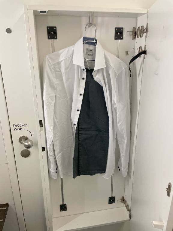 Ein besonderes Feature bietet die SWISS Arrival Lounge darüber hinaus. Dieser Vorteil kommt unscheinbar in Form eines Schrankes an der Tür der Duschräume daher. Wer hier seine Kleidungsstücke einhängt und ein entsprechendes Knöpfchen drückt, bekommt die Teile nach wenigen Minuten gebügelt zurück. Das geht so schnell, dass die Dusche dafür meist ausreicht.
