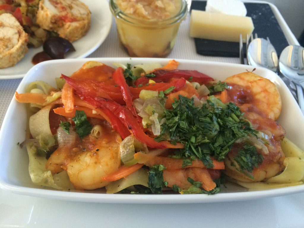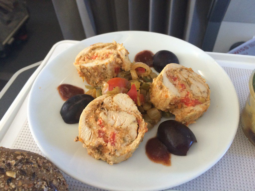 Das Essen wurde auf diesem Flug, zusammen mit Vorspeise, Hauptspeise, Käse und Dessert auf einem Tablett zusammen serviert. Dazu wurde ein Brotkorb angeboten.