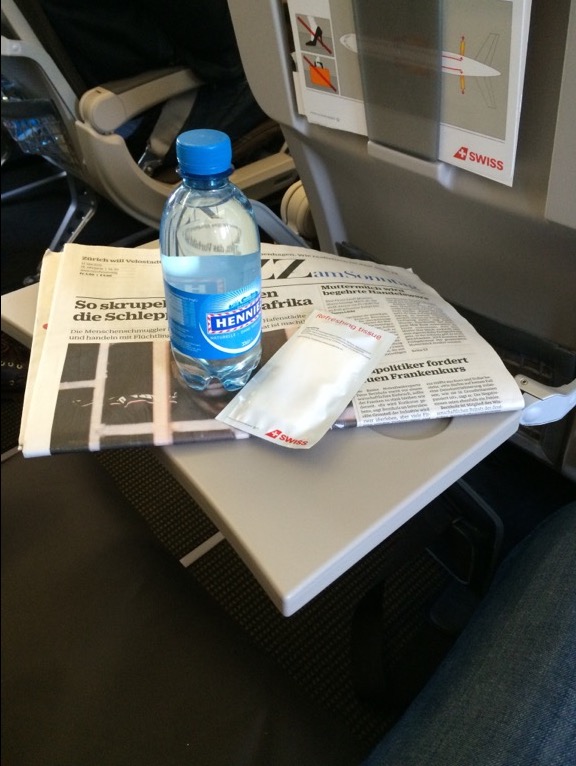 Der Service Ablauf unterscheidet sich, auch auf diesem sehr langen Flug, nur marginal von einem anderen Swiss Business Class Flug auf der Kurzstrecke. So werden noch am Boden Wasser und Erfrischungstücher, sowie Tageszeitungen verteilt.