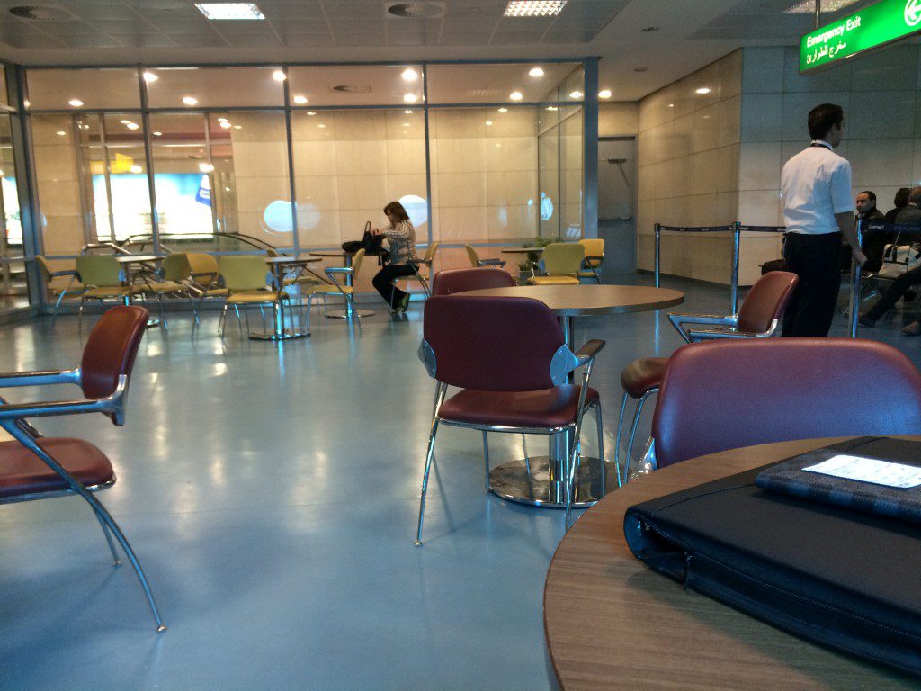 In Kairo gibt es keine zentrale Sicherheitskontrolle, sondern vor jedem Gate eine individuelle Sicherheitskontrolle. Dabei werden erst die Bordkarten gescannt und man hiermit quasi geboardet, bevor man durch die Sicherheitskontrolle läuft. Im Wartebereich des Gates gibt es einen abgesperrten Bereich für First- und Business Class Passagiere, sowie für Star Alliance Goldkarten Inhaber. Wir haben uns hier niedergelassen, da der Flug noch nicht zum Einsteigen bereit war, obwohl er als Boardend auf den Bildschirmen angezeigt wurde.