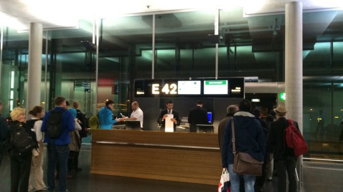 Auch wenn ich gerne noch die tolle Swiss First Class Lounge E genutzt hätte, fehlte hierfür einfach die Zeit. Daher habe ich mich direkt auf den Weg zu meinem Abfluggate gemacht. Als ich bei E 42 angekommen war, war das Boarding schon im Gange. Dabei stiegen links vom Abfluggate die Economy Class ein und rechts die First- und Business Class, sowie Star Alliance Gold Karten Inhaber.