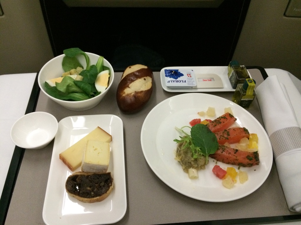 Kurz darauf wurde der Tisch mit Tischdecken eingedeckt und die Vorspeise serviert. Swiss serviert hierbei die Vorspeise, samt Brot, Käse und Salat auf einem Tablett. Zwar sieht die Präsentation für mich sehr gut aus, allerdings finde ich ein Tablett in der Business Class nicht mehr ganz zeitgemäß. Allerdings geht der Service so deutlich schneller.