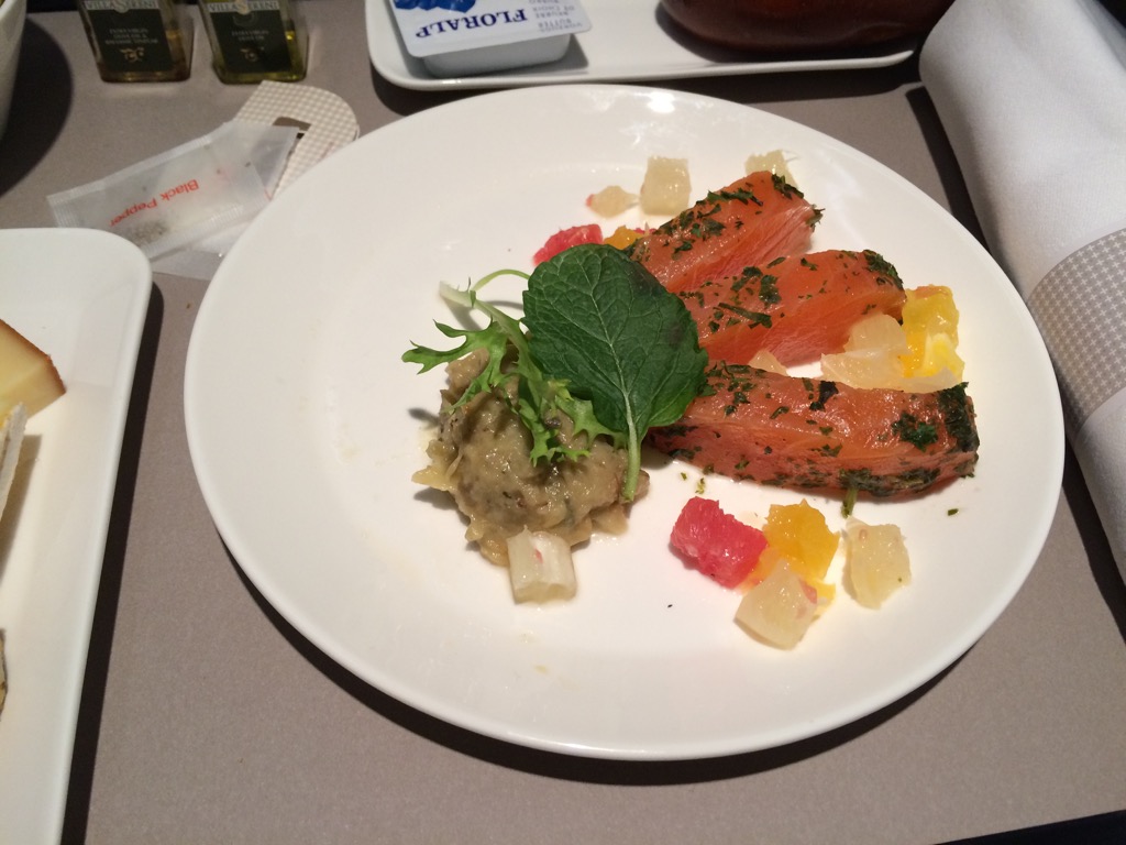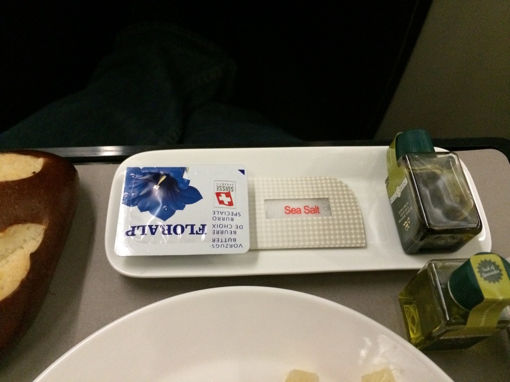 Der Lachs mit Auberginenmousse war sehr gut und nach meinem Geschmack. Wo Swiss noch nachbessern kann ist an der Butter und den Salz- und Pfeffer Tüten. Dies ist in der Business Class unpassend. Positiv und wertig empfand ich dagegen das Angebot von Olivenöl zum Brot.