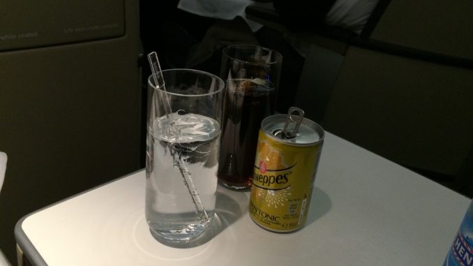 Etwa 15 Minuten nach dem Start auf 20.000 Fuß wurden die Anschnallzeichen ausgeschaltet und die Crew begann mit Ihrem Service. Zu Beginn wird ein Aperitif vom Wagen serviert. Ich habe mich für eine Cola Light und einen Gin&Tonic entschieden.