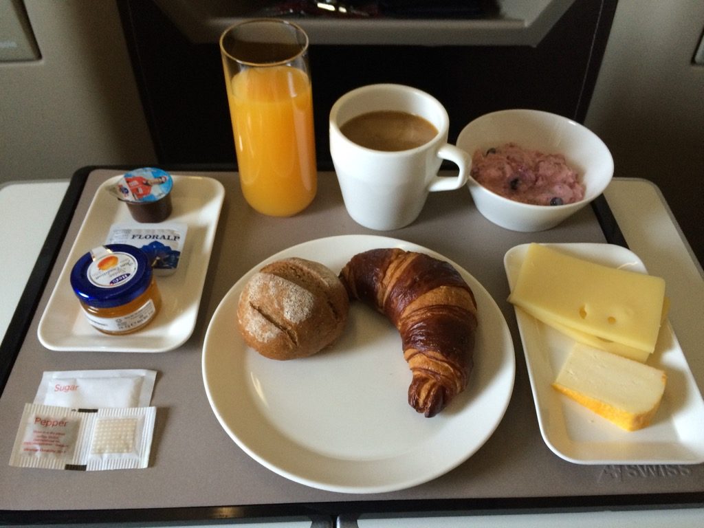Der Swiss Frühstücksservice in der Business Class ist wieder ein wenig eigen, allerdings sehr effizient. So bekommt jeder Passagier von einem Servierwagen ein Tablett mit der Aufdeckung, sowie die gewünschten Getränke. Mein doppelter Espresso zum Wachwerden musste natürlich in der Galley geordert werden, allerdings kam er nach wenigen Minuten, noch bevor ich meinen Kaffee ausgetrunken hatte.