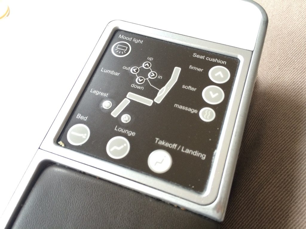 Ebenfalls in der Armlehne untergebracht ist neben der Sitzverstellung (inkl. Sitzhärtenregelung) auch die Fernbedienung für das persönliche Entertainment System.