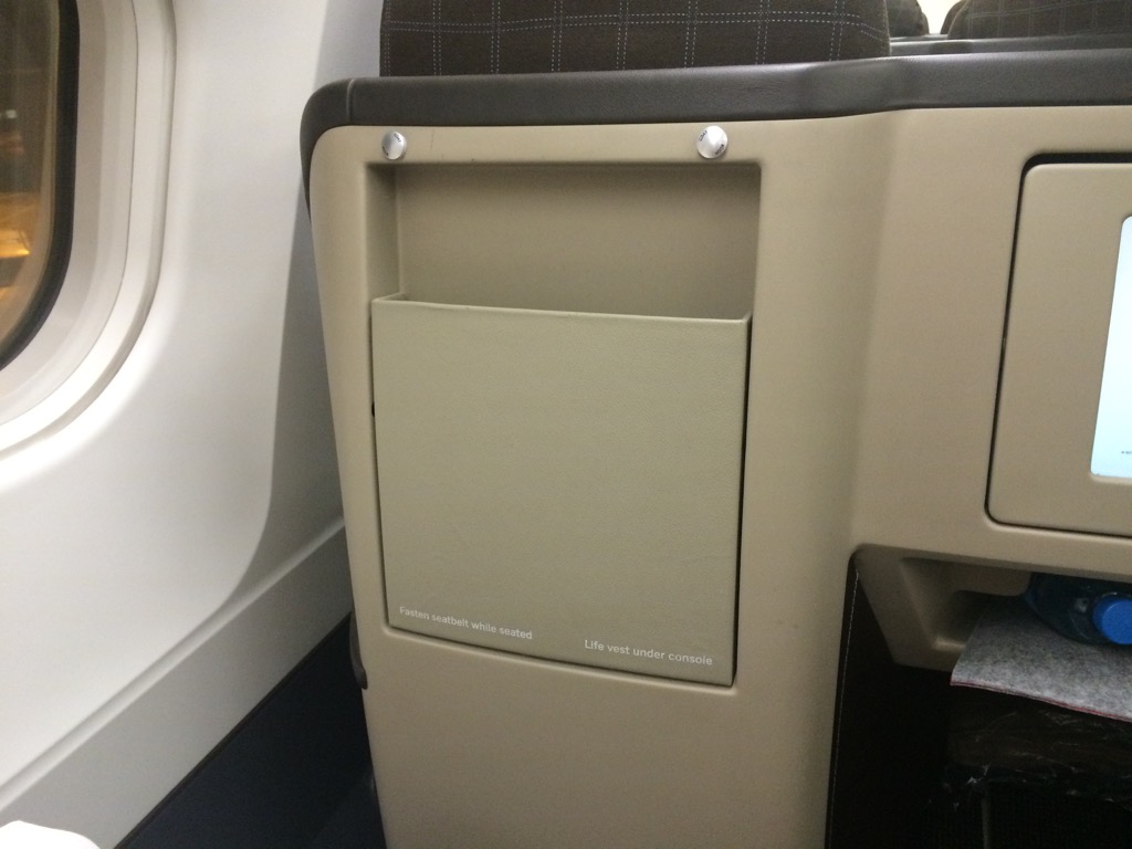 Eine Sache, welche mich immer begeistert sind die vielen Ablagemöglichkeiten bei diesem Sitz. Neben den zwei großen Ablagen links und rechts neben der Armlehne, gibt es auch noch zwei Literaturtaschen, ein Staufach unter dem Fernseher, sowie ein Schuhfach am Boden. So lassen sich alle Dinge, welche man während des Fluges benötigt problemlos verstauen.