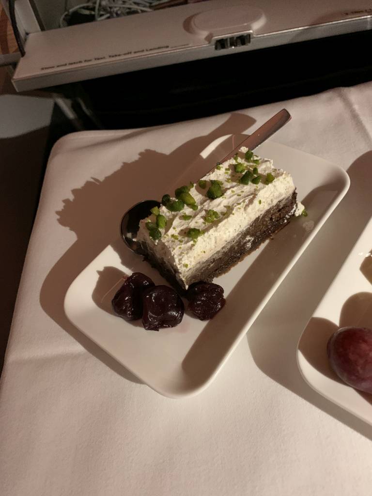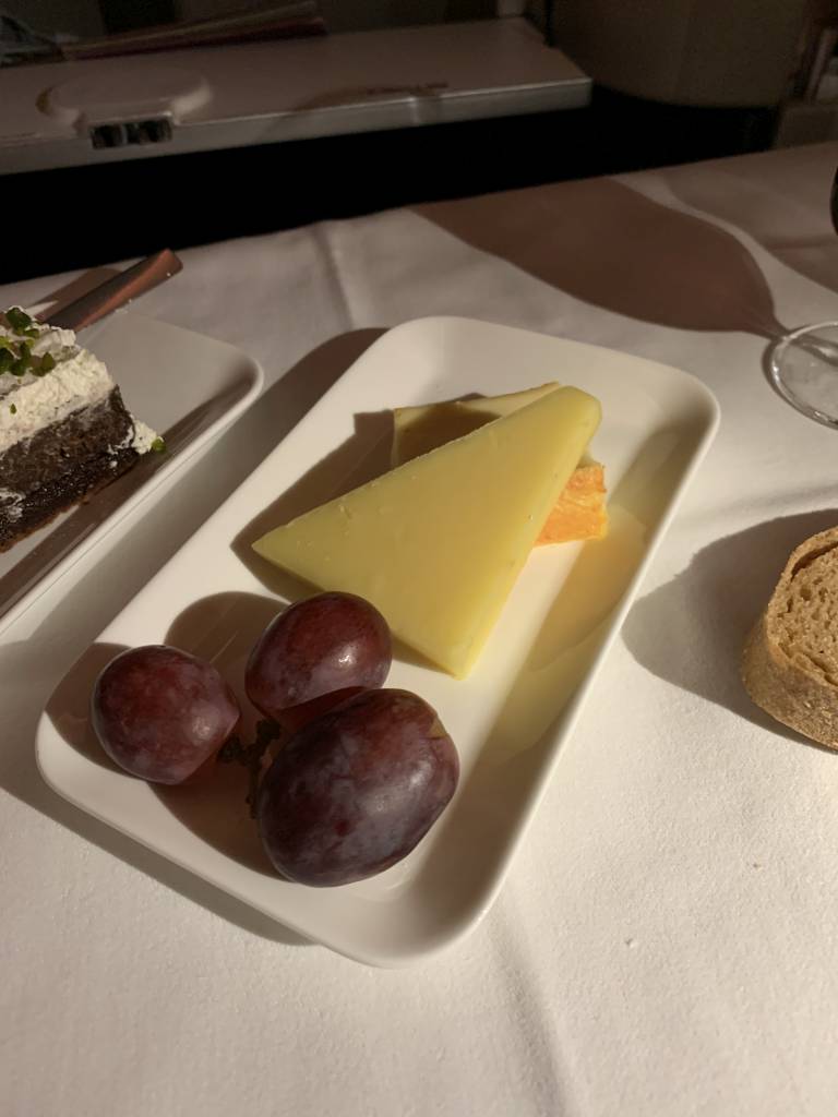 Umso mehr freute ich mich auf den Nachtisch. Auch wenn der Portwein bei Swiss leider nichts Besonderes ist, ist ein Gläschen kombiniert mit Käse für mich das Highlight auf jedem Flug. Der Käseteller dürfte gerne etwas umfangreicher ausfallen. Dafür gab es noch ein Stück Torte und eine super leckere Selektion an Pralinen.