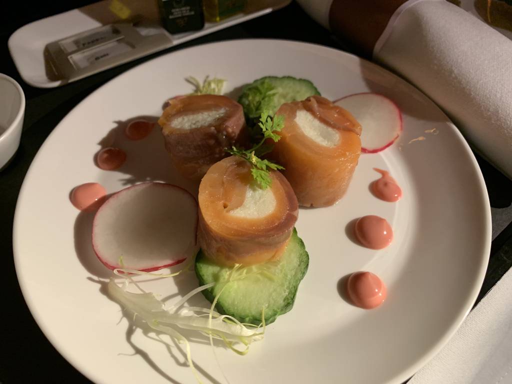 Direkt nach dem Start sollte noch ein vollständiges Dinner serviert werden. Wir waren gespannt, denn während auf dem Flug nach Hongkong ein Restaurant aus dem Kanton Graubünden Pate für das Catering stand, wurde es diesmal von einem Hotel aus Hongkong zusammengestellt. Ich war gespannt auf den Vergleich.