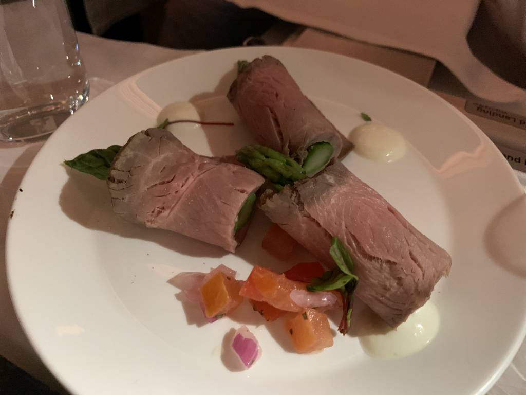 Als Vorspeise wurde ein Tablet serviert, welches aus einem Garten-Salat und einem kleinen Käse-Teller, sowie eine Vorspeise nach Wahl bestand. Wir entschieden uns für die Lachsröllchen gefüllt mit Frischkäse und Spargel eingerollt in Roastbeef. Die beiden Vorspeisen waren hervorragend.