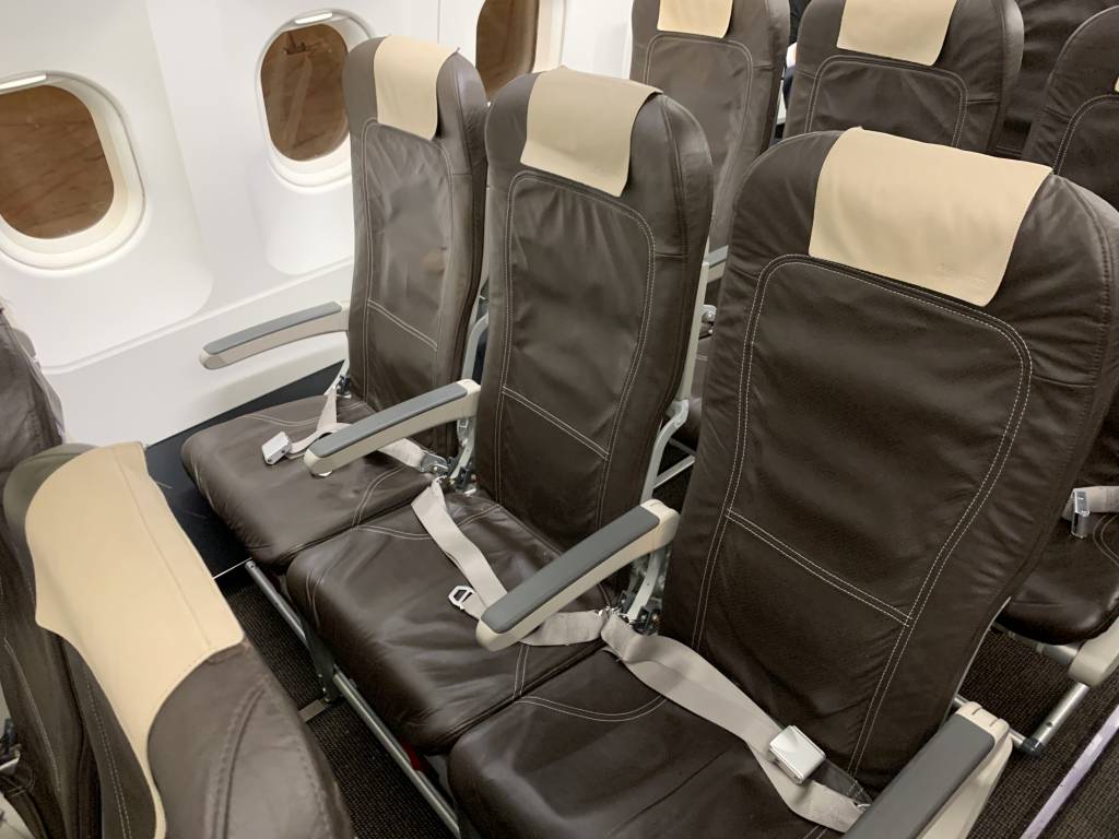 Die Swiss Airbus A321 verfügen über die übliche 3-3-Bestuhlung. Dabei gibt es drei Konfigurationen mit bis zu 219 Sitzen. Die Economy Class wird von der Business Class durch einen Vorhang getrennt. Der Vorhang war bei unserem Flug ziemlich weit hinten noch hinter der ersten Notausgang-Reihen. Wir haben uns das mit Gewichtsverteilung bei diesem eher wenig ausgelastetem Flug erklärt. Laut SeatGuru scheint es jedoch im A321 regulär eine von drei Konfiguration mit 68 Business Class und 108 Economy Class sitzen zu geben.