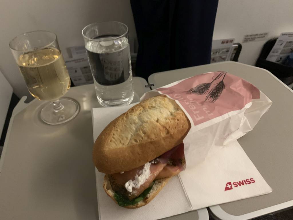 Daher wurde uns schon vor dem Abflug eine Flasche Wasser und ein Erfrischungstuch ausgehändigt. Während des Fluges wurde dann ein in einer Papiertüte verpacktes Sandwich mit Lachs, Frischkäse und Zwiebeln verteilt. Das Sandwich war lecker und könnte Lufthansa gut als Vorbild für ein „wertiges Sandwich“ dienen.