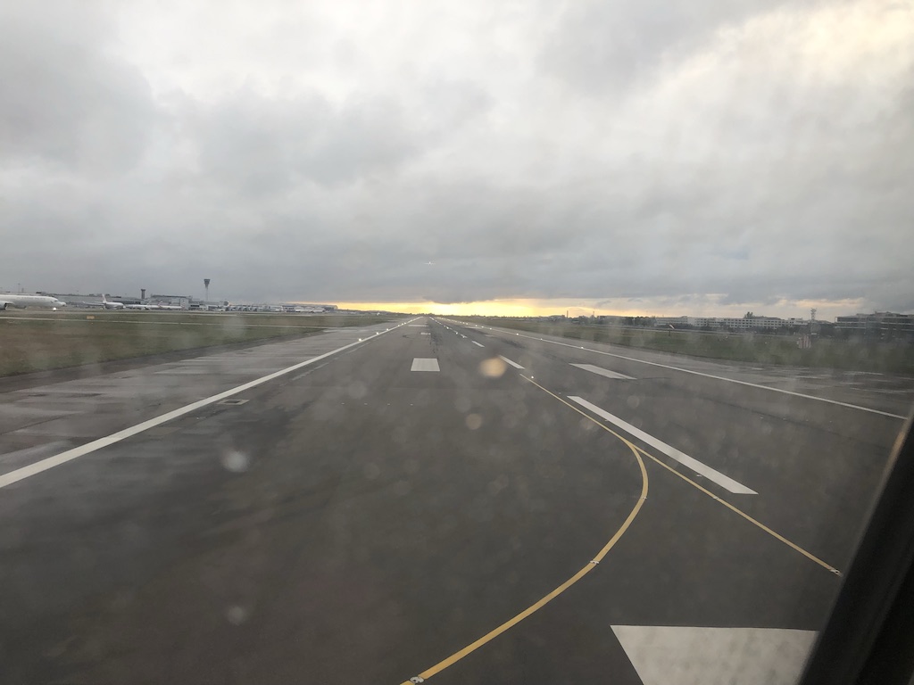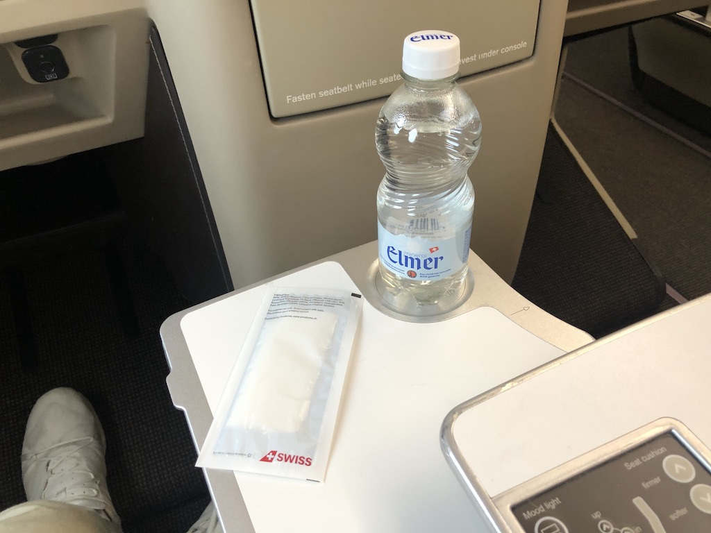 Einen Welcome Drink gibt es bei Swiss auf Kurzstrecke auch dann nicht, wenn ein Großraumjet zum Einsatz kommt. Eine Flasche Wasser samt Erfrischungstuch ist aber Standard und wurde persönlich am Boden gereicht. Nach dem kurzen Sicherheitsvideo ging es Richtung Startbahn, die Abendsonne funkelte dabei noch etwas durch die Wolkendecke.