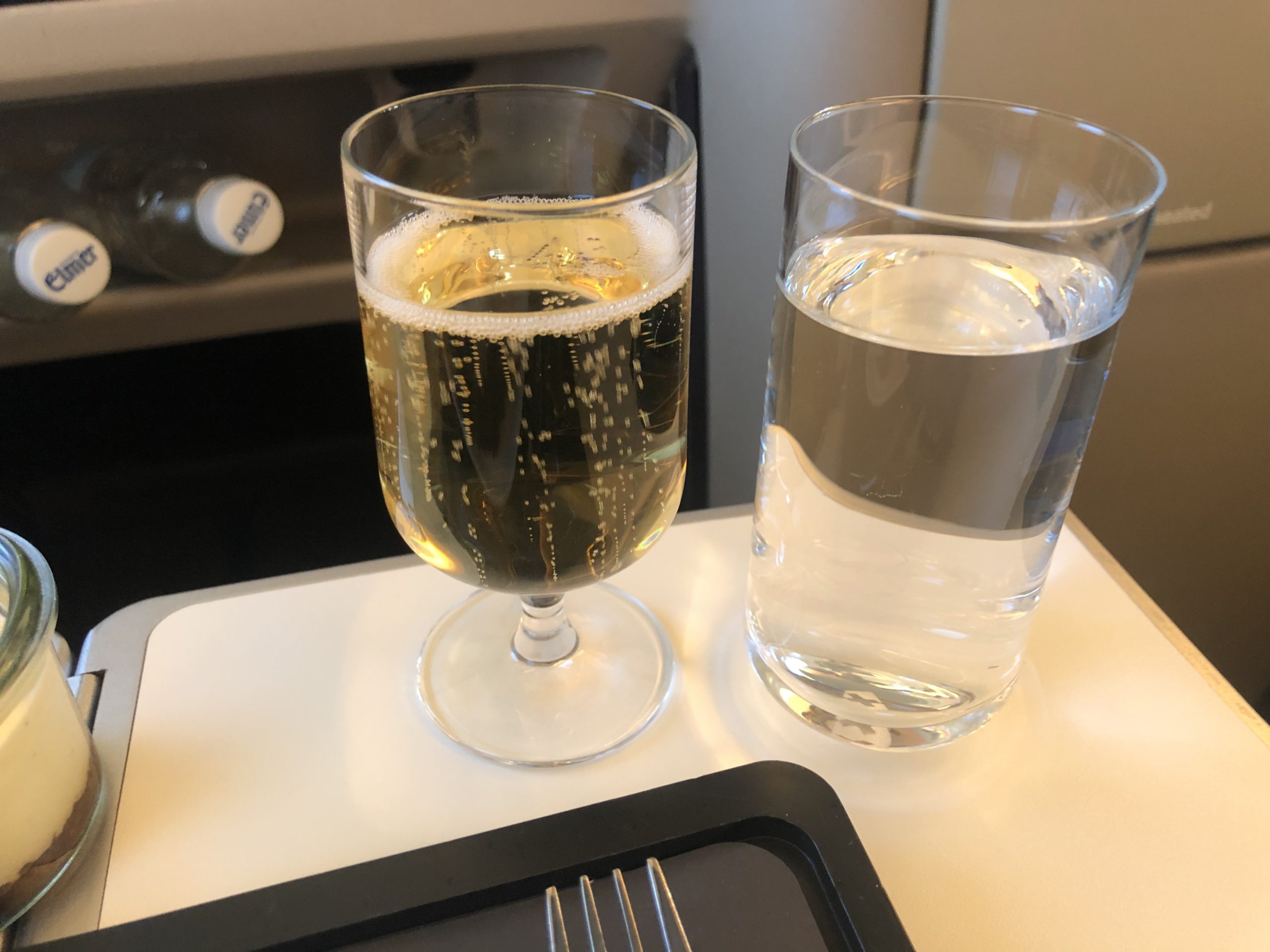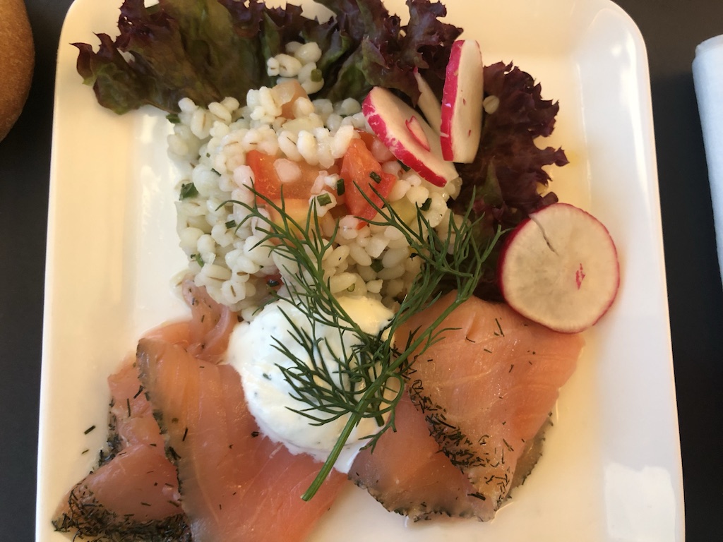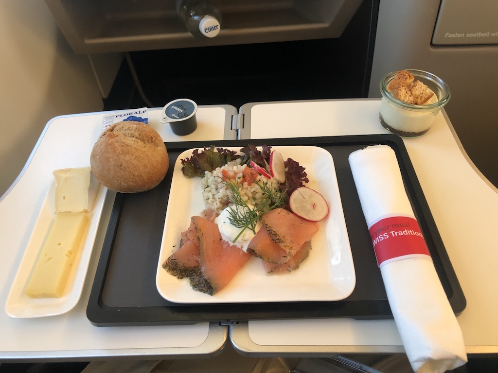 Es gab Lachs mit Graupen, etwas Käse und eine Art Tiramisu. Swiss gehört zu den Airlines die auch auf Kurzstrecken Champagner ausschenkt. Die Gläser wurden mehrmals aufgefüllt, die Crew war entspannt und nutzte die Zeit mit den Gästen zu plaudern.