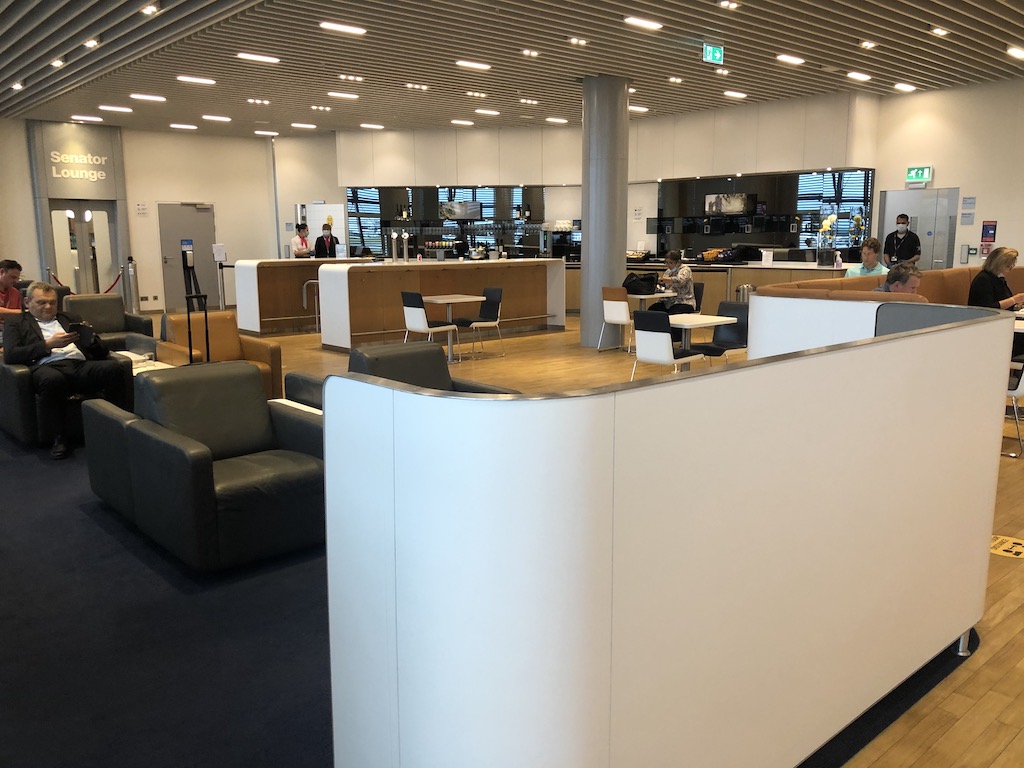 Lufthansa bietet also die einzige Lounge für Abflüge der Star Alliance. Diese ist relativ groß und ermöglicht einen Blick auf das Vorfeld. Der gesonderte Bereich für HONs, Senatoren und Star Alliance Gold Mitglieder ist aktuell geschlossen. Es werden nur kalte Snacks und Speisen angeboten und vom Personal am Buffet ausgegeben.
