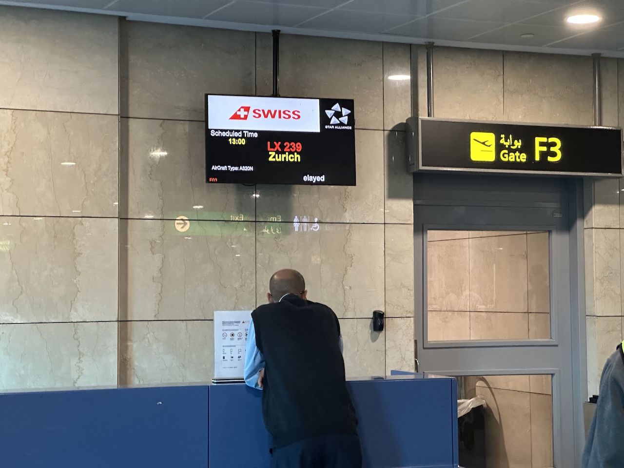 Die erste Sicherheitskontrolle fand in Kairo schon vor den Check-In Schaltern statt, hier mussten wir ca. 15 Minuten warten. Wir haben zwar online eingecheckt, aber keine Bordkarten sondern nur eine Bestätigung erhalten, die im Airport mehrfach überprüft wurde.