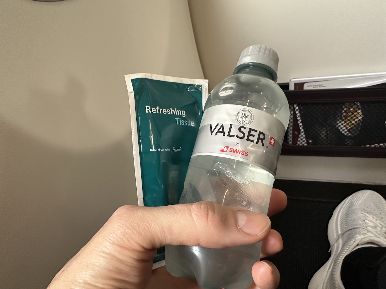 Wie immer erhalten die Fluggäste der Business Class schon am Boden eine Wasserflasche und ein Erfrischungstuch.