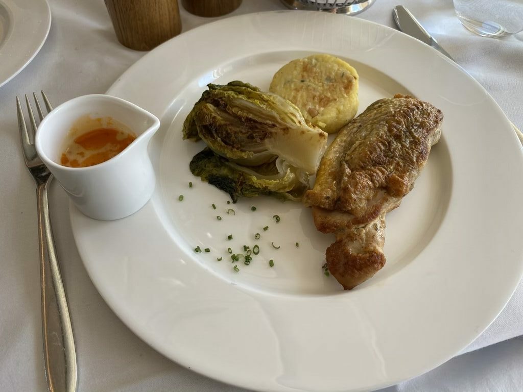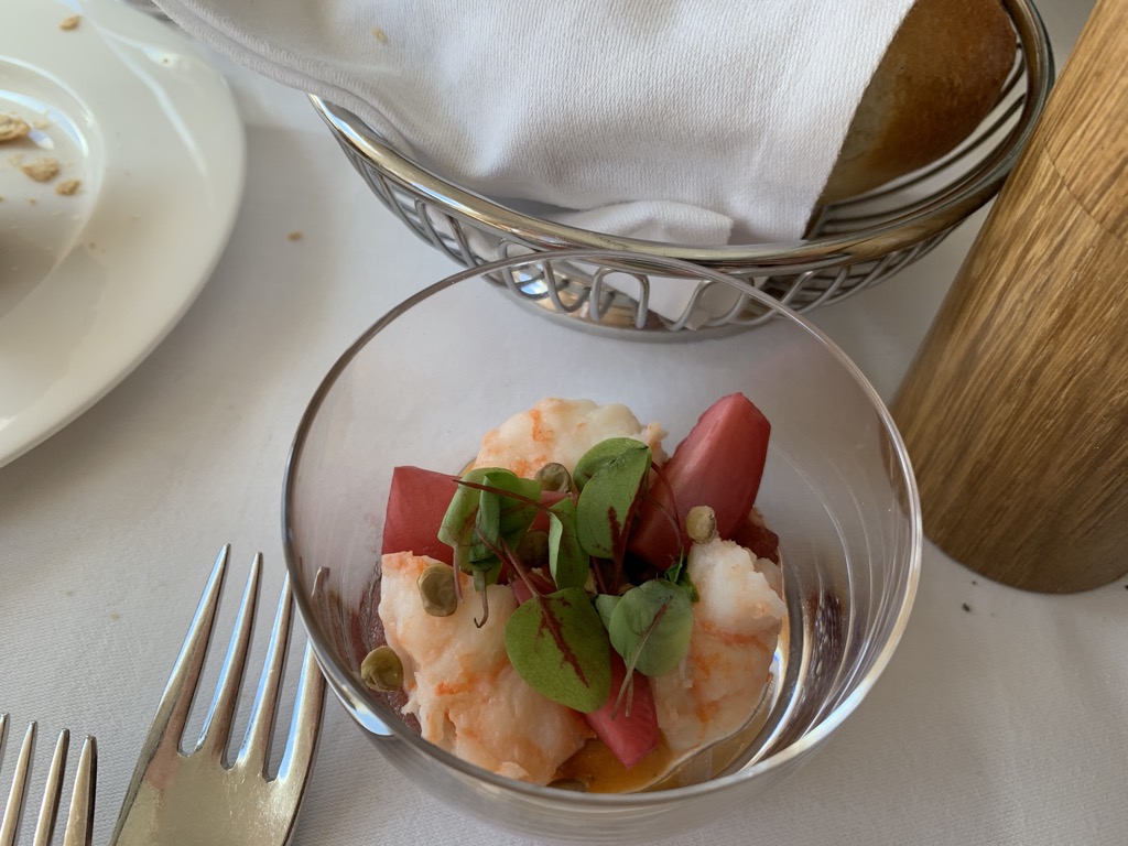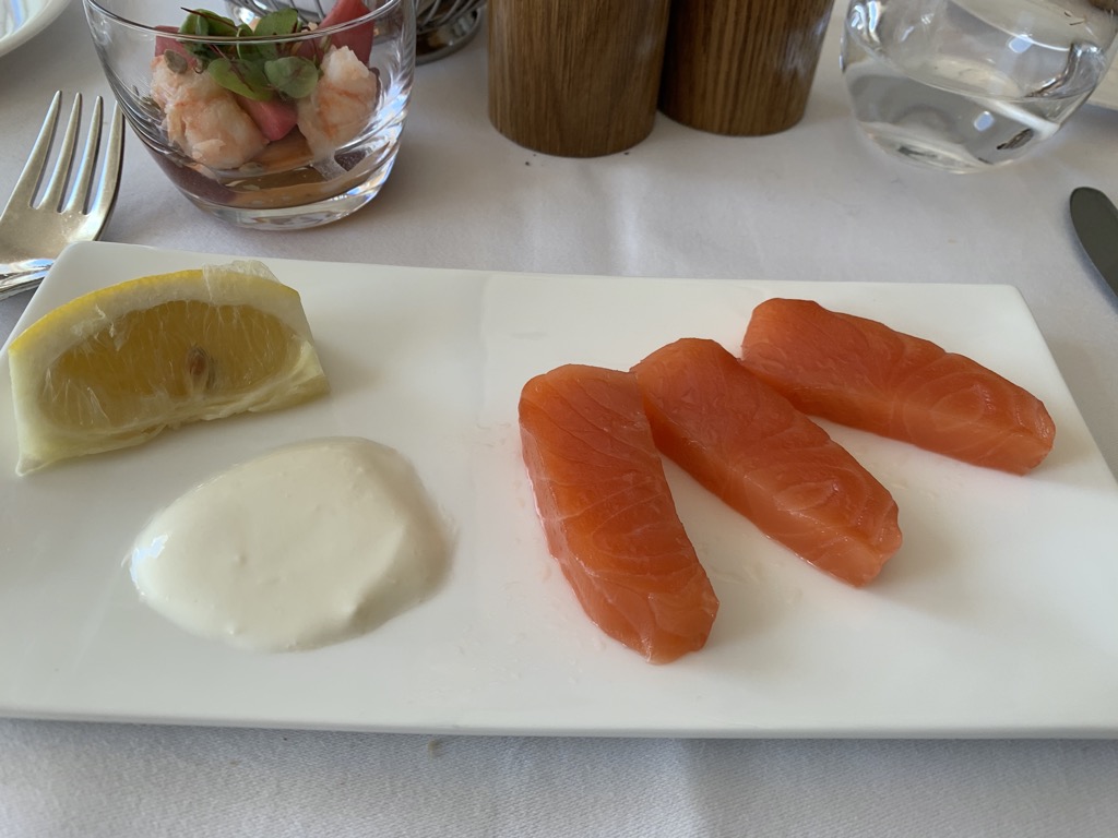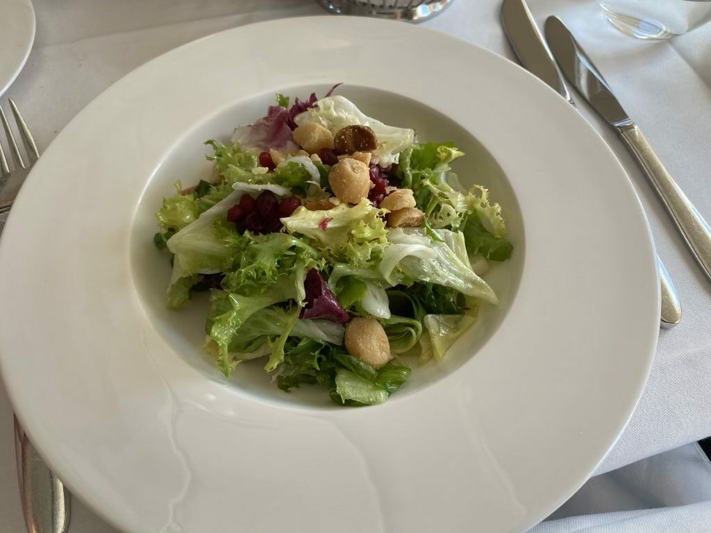 Nach einem kurzen Gruß aus der Küche folgte das abwechslungsreiche Menü. Christoph startete mit dem beliebten Balik-Lachs und einem Shrimps-Cocktail, ich bestellte einen Salat der Saison mit Macadamianüssen. Ungewöhnlich für mich war, dass ich mir, genauso wie Christoph Fleisch bestellte, denn meist esse ich vegetarisch – wir waren aber beide zufrieden.