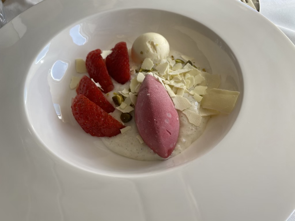 Bei Nachtischen bin ich tatsächlich etwas schwieriger. Hier fehlt mir bei vielen Airlines meist die Kreativität, da man oft einfach zwischen Obst, Schokokuchen und Käse wählen kann. Während Christoph sich immer sehr über die Käseplatte freut, auch wenn diesmal sein Lieblingskäse Tête de Moine fehlte, war ich positiv von dem Dessert überrascht. Am liebsten hätte ich mir noch eine zweite oder dritte Portion bestellt ;).