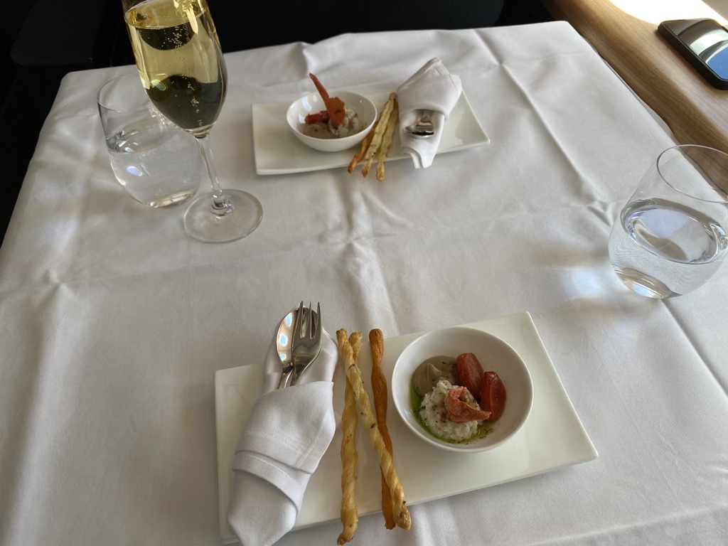 Wie üblich wurde vor dem Start bereits ein Begrüßungsgetränk gereicht, gemeinsam mit warmen Nüssen. Christoph entschied sich natürlich für den Champagner, ich für einen Orangensaft.