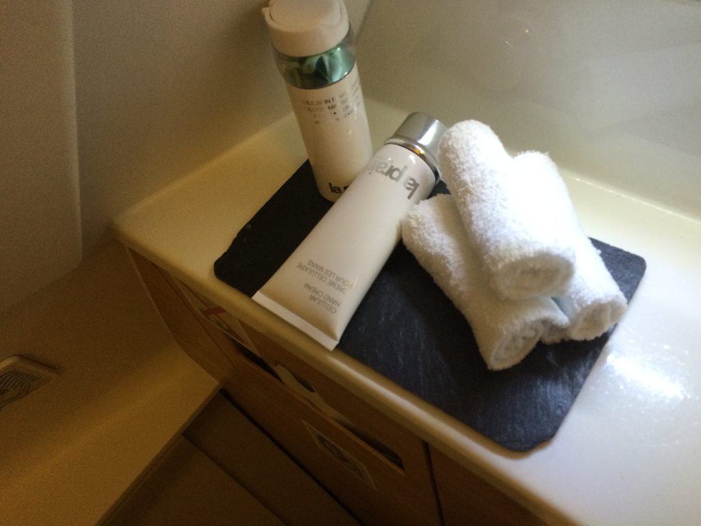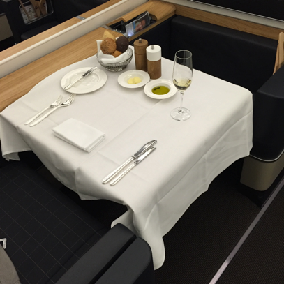Nach dem Start wurde mit dem Bordservice begonnen. Vorspeisen und Dessert werden jeweils von einem Servierwagen aus serviert, die Hauptspeisen werden in der Küche zubereitet. Mir gefällt es sehr gut, dass es möglich ist mit seinem Reisepartner zusammen am Tisch zu essen. Der Tisch ist groß genug und bietet Platz für beide. Der Ottomane ist ebenfalls bequem zum Sitzen und man hat sogar die Möglichkeit sich anzuschnallen.