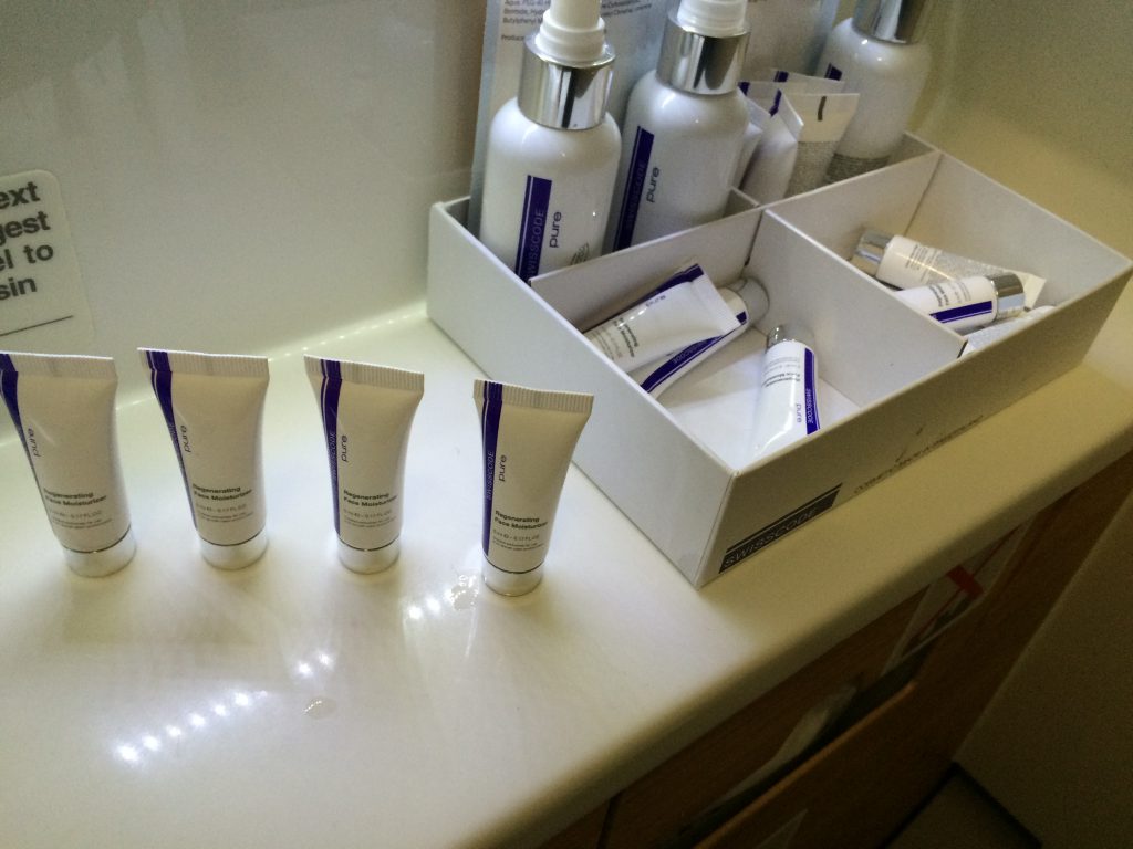 An Bord angelangt wurde man schon mit dem Pre-Flight Snack begrüßt, welcher in meinem Fall aus Thunfisch und Sprüngli Flutes bestand. Als Statuskunde wird man ebenfalls vom Maitre de Cabin persönlich willkommen an Bord geheißen. Als Amenity Kit erhielt man noch ein Bally Necessaire (das ist auf den heutigen Flügen nicht mehr so) mit Zahnbürste, Ricola Bonbons , Kamm und Schlafbrille/Ohrenstöpsel/Socken. Das Pyjama ist von Zimmerli und sehr bequem!