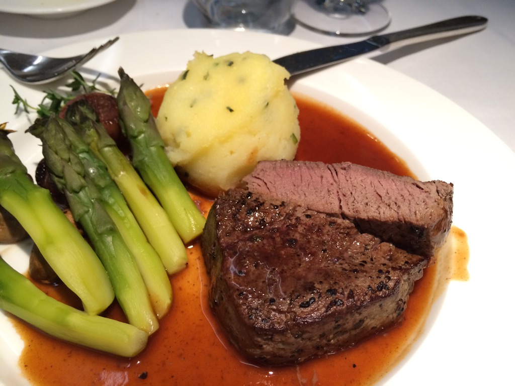 Als Hauptgang habe ich das Rinderfilet mit Rotweinsauce, Kartoffelpüree und grünem Spargel bestellt.