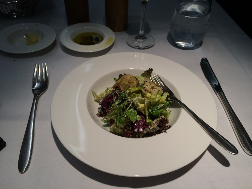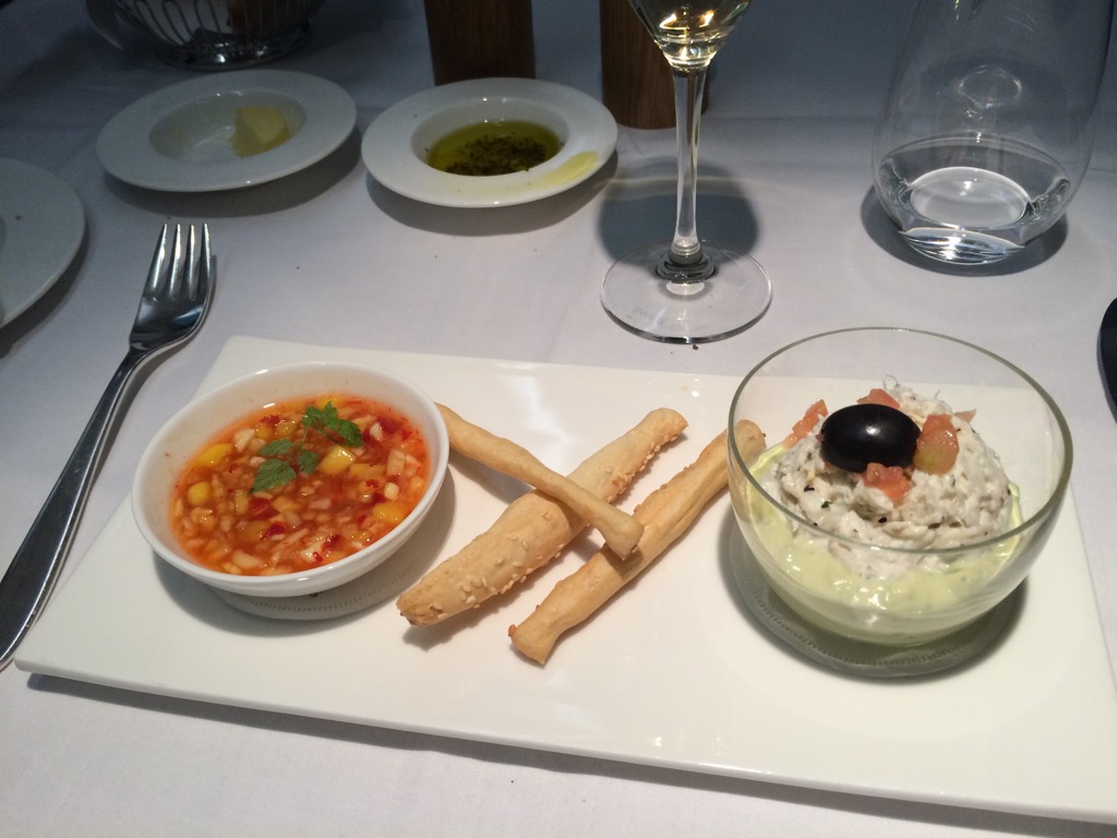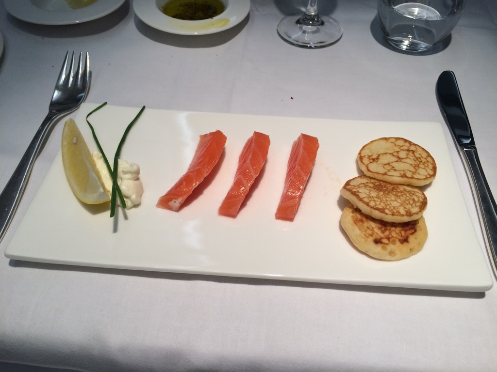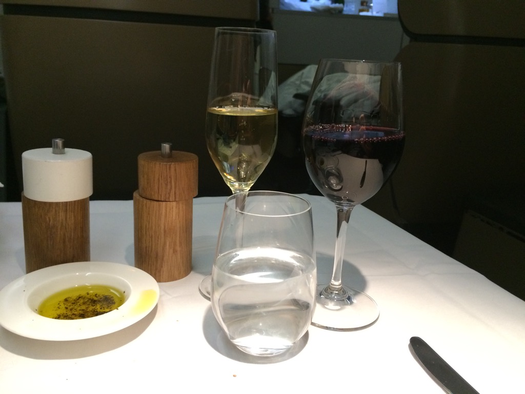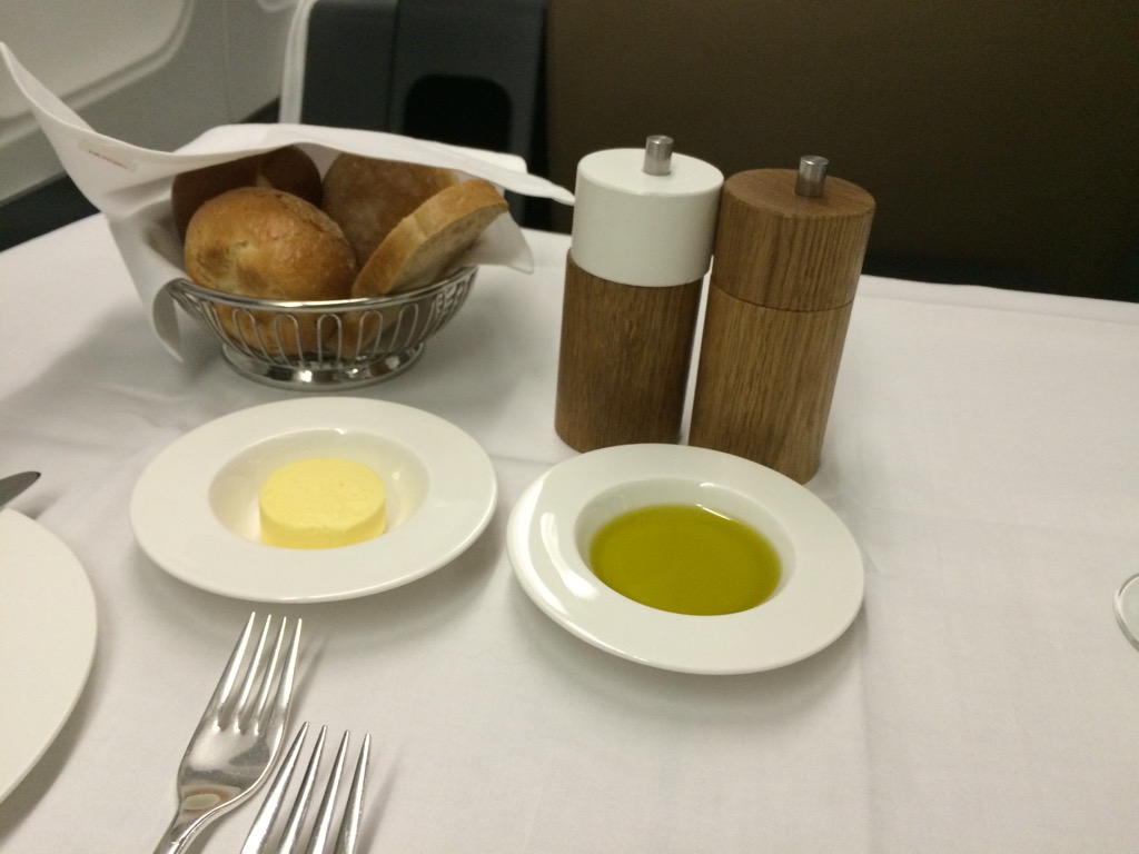 Die Details, wie die großen Salz und Pfeffer Streuer, Brotkorb, Butter und Olivenöl runden das Bild ab. Bei einem Glas Champagner wartete ich auf meine Vorspeise. Die Essensbestellung habe ich bereits vor dem Start aufgegeben.