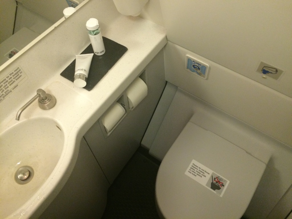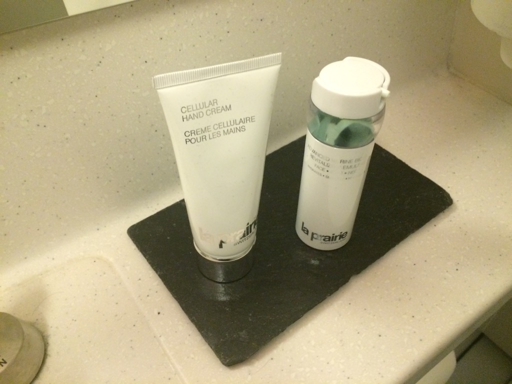 Einer meiner größten Kritikpunkte an der Swiss First Class im Airbus A340-300 und dem Airbus A330-300 ist, dass es nur ein Badezimmer gibt. Das Badezimmer ist dabei auch noch vergleichsweise klein und bietet keinen Unterschied zu einem „normalen“ Flugzeugwaschraum. Einzig die sehr hochwertigen la prairie Cremes, sowie Stoffhandtücher machen den Unterschied.