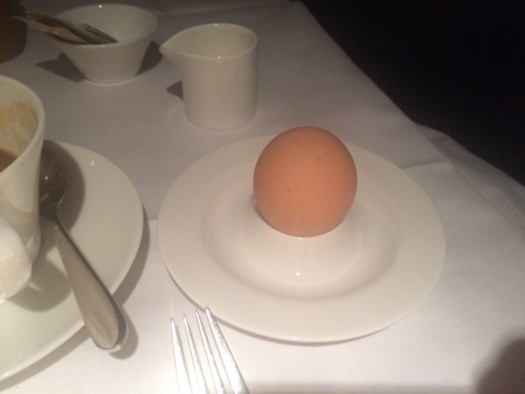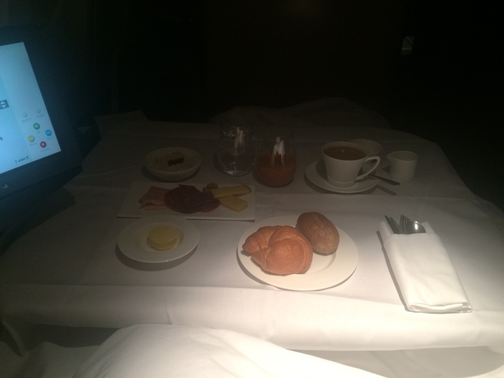 Ich habe mir noch ein schnelles Frühstück im Bett servieren lassen. Neben etwas Brot, Wurst und Käse, sowie Bircher Müsli, hat mir besonders das 5 Minuten Ei gefallen. Dieses wurde im Flugzeug gegart und war wachsweich.