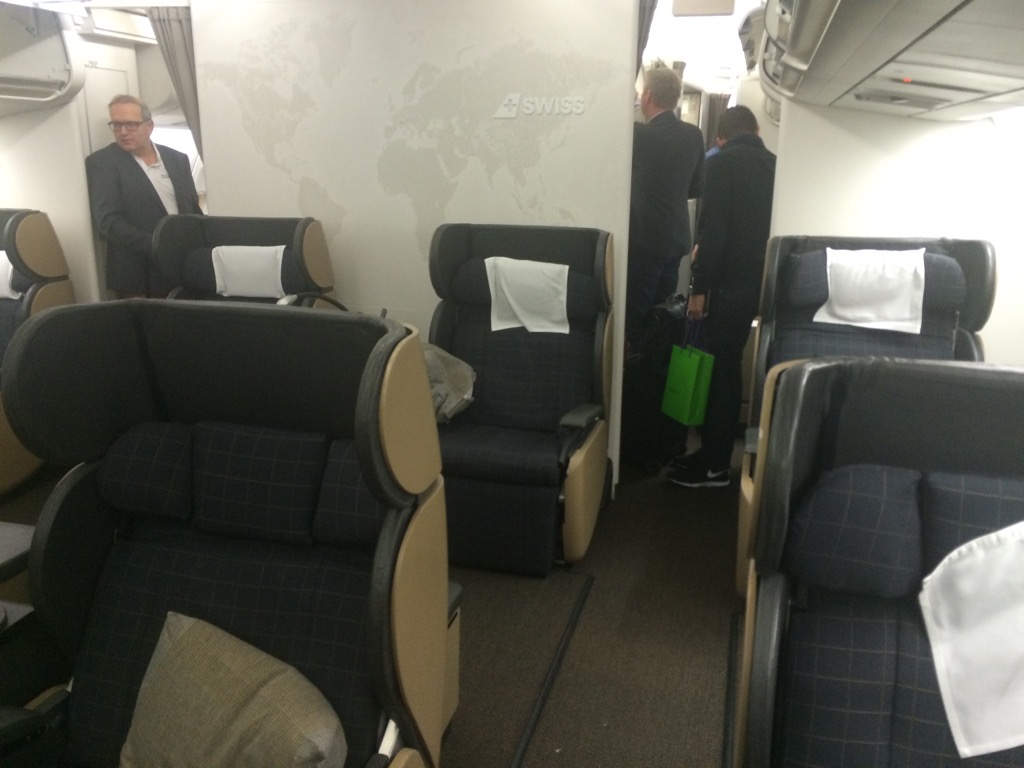 Übrigens kann man auch in der Swiss First Class im Airbus A340-300 auf dem Ottomanen eines jeden Sitzes Platz nehmen und sich gegenübersitzend essen. Der Ottomane verfügt hierzu über einen eigenen Sicherheitsgurt.